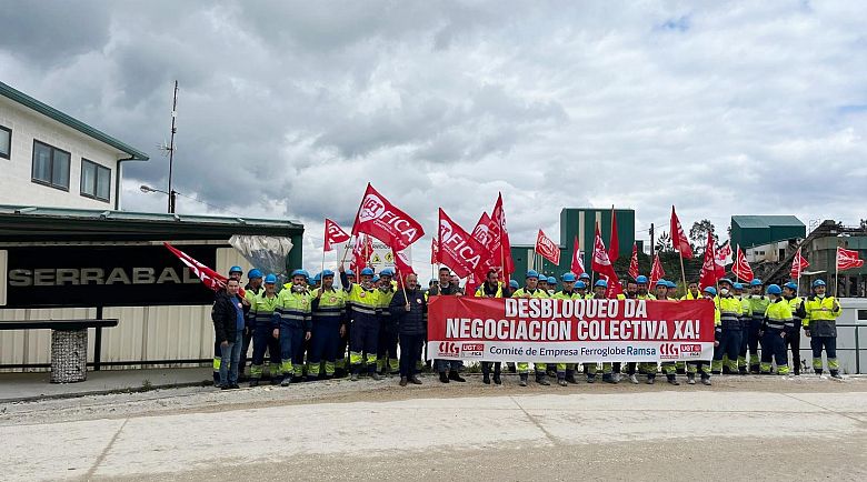 Traballadores e traballadoras de FerroGlobe concentráronse esta tarde diante da fábrica de Sabón (Arteixo) en resposta ao bloqueo da negociación colectiva e para reclamar melloras salariais. A protesta desenvolveuse coincidindo co cambio de quenda e de xeito simultáneo nos distintos centros de traballo do grupo empresarial, agás na mina de Serrabal (Ramsa) onde o persoal fixo a protesta na xornada de onte, martes.