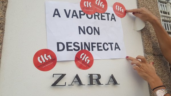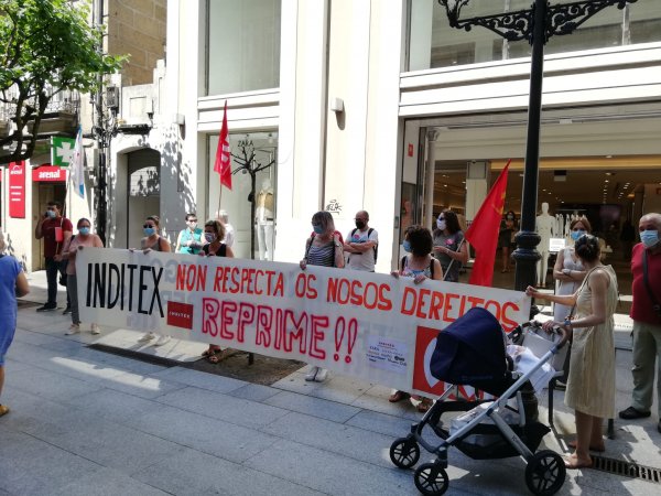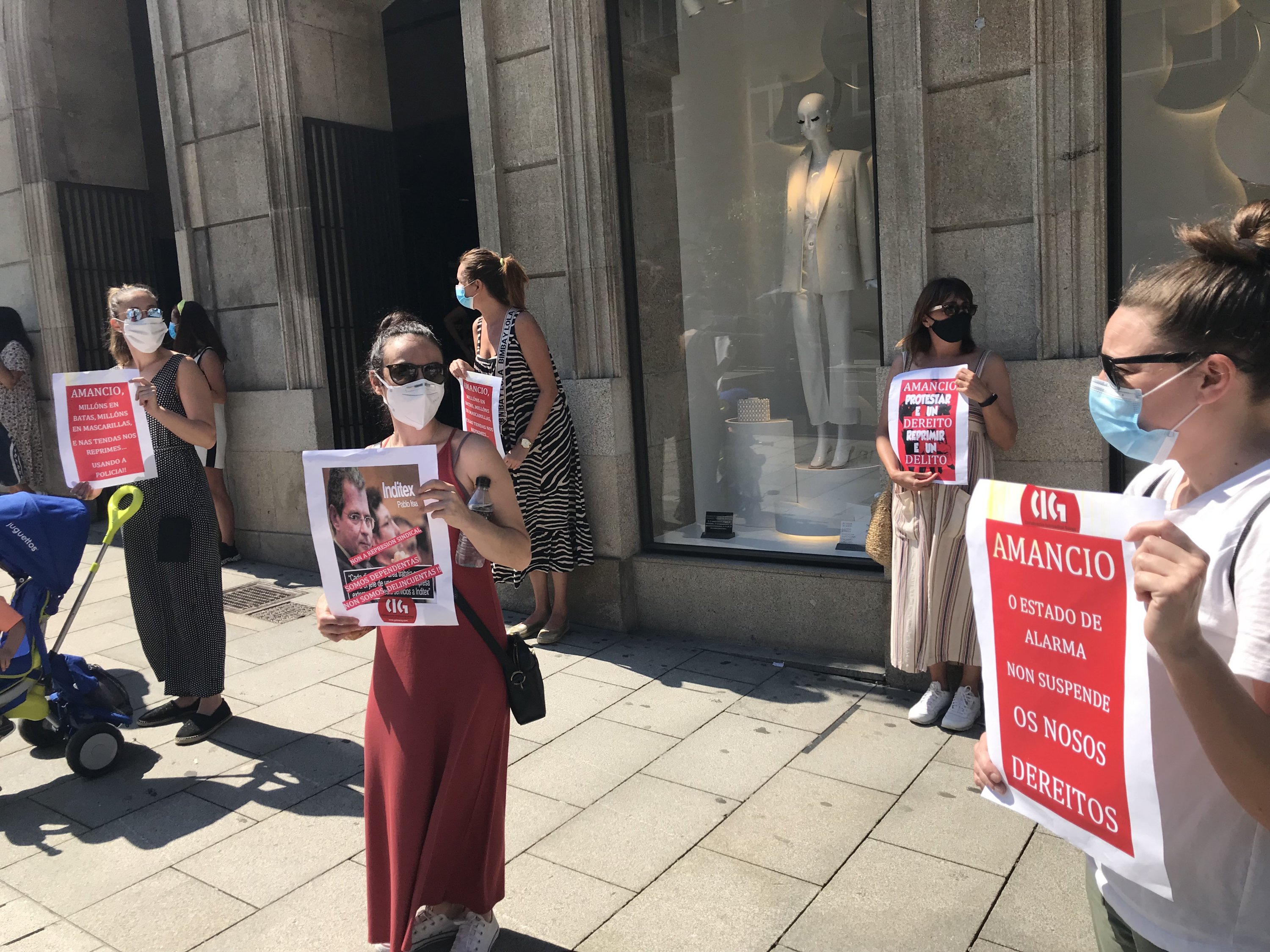 Traballadoras/es das tendas das distintas marcas do grupo téxtil Inditex desenvolveron hoxe concentracións ás portas de varios establecementos na Coruña, Vigo, Ourense, Lugo e Santiago para rexeitar a modificación de horarios imposto pola dirección. A medida, que foi denunciada pola CIG diante da Inspección de Traballo, afecta tamén o persoal con concreción horaria para o coidado de crianzas, o que imposibilita a conciliación da vida laboral e familiar.