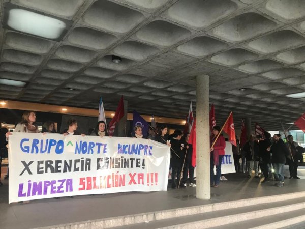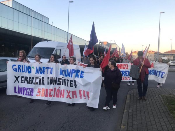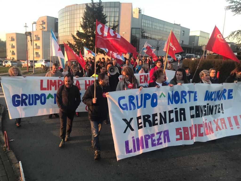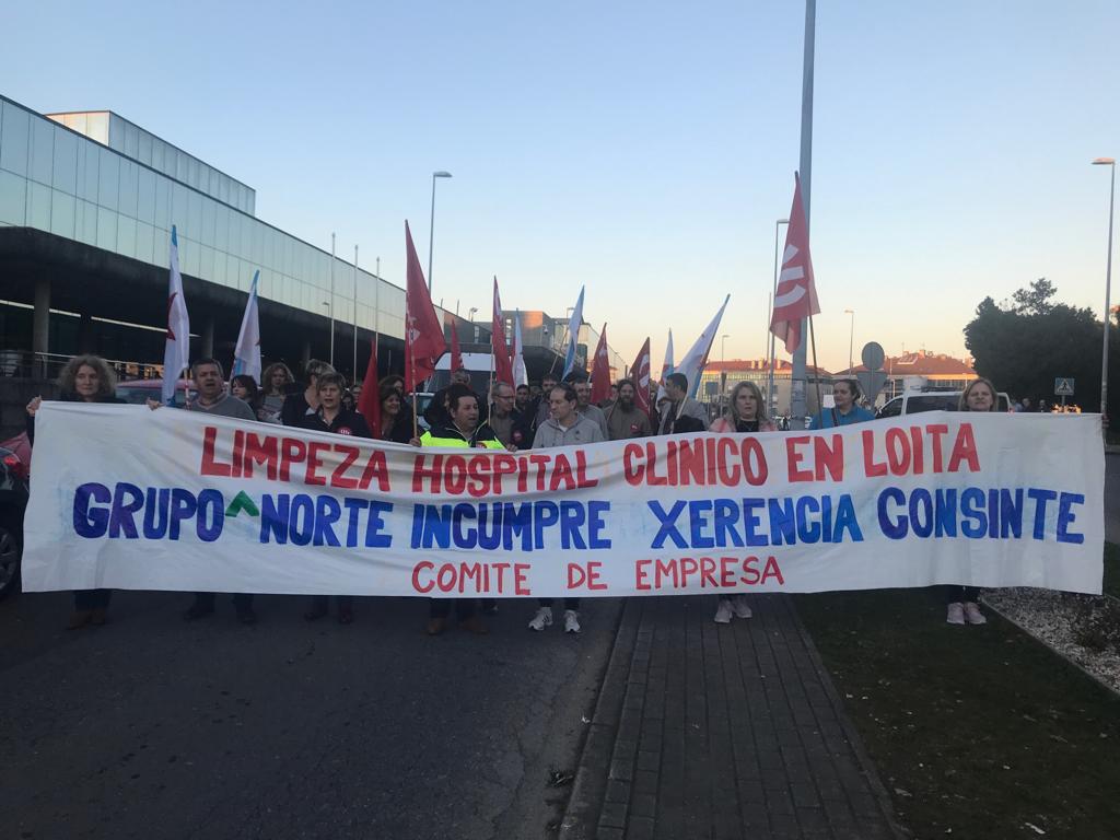 .O persoal do servizo de limpeza do Hospital Clínico, concesionado ao Grupo Norte, saíu esta tarde en manifestación desde a propia entrada do complexo hospitalario até a rotonda do Camiño francés para denunciar desde incumprimentos do convenio colectivo até incumprimentos na propia oferta que a empresa presentou no proceso de licitación desta contrata pública, no ano 2017.