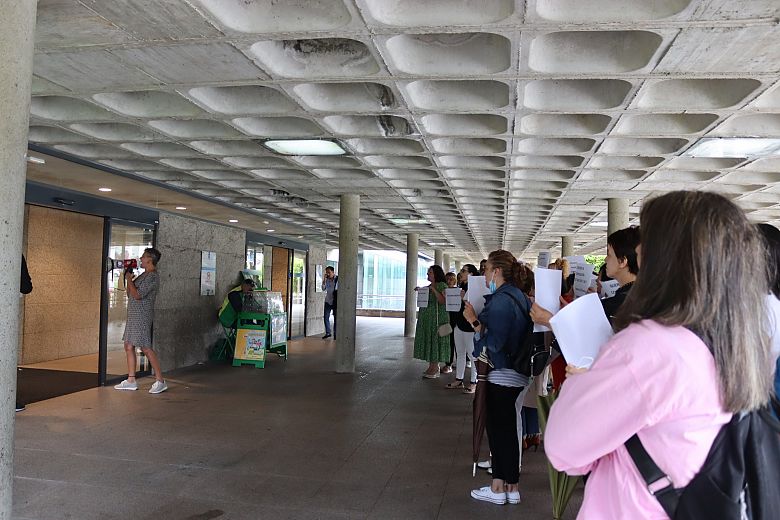 Traballadoras dos servizos de limpeza dos hospitais Clínico, Gil Casares e Provincial concentráronse esta mañá ás portas do Clínico para denunciar os incumprimentos do convenio e de acordos acadados por parte da concesionaria, UTE-Ilunion. Por iso xa adiantaron que, de non se resolver antes a situación, á volta do verán iniciarán un calendario de protestas, sen descartar ningún tipo de mobilización.