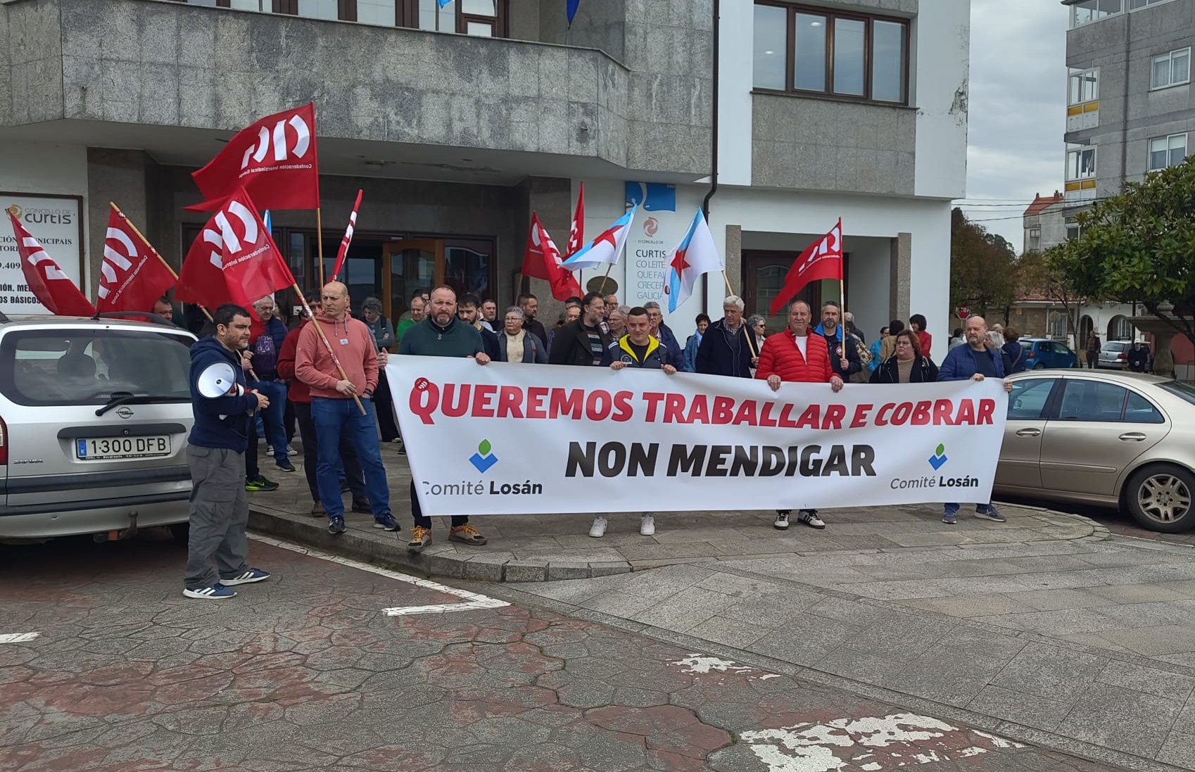 Traballadores e traballadoras de Losán concentráronse na mañá deste mércores diante da Casa do Concello de Curtis para reclamar un plan de viabilidade que garanta a continuidade dos empregos e da actividade industrial, o cobro inmediato de todas as nóminas pendentes e a implicación das administracións no futuro das plantas que a empresa ten en Galiza.