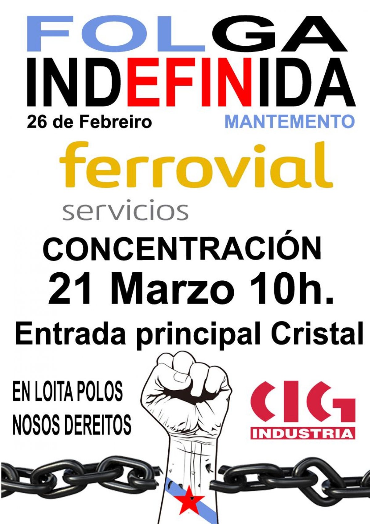 Os empregados/as de Ferrovial, que retomaron a folga indefinida este pasado martes tras suspendela durante as negociacións coa empresa, desenvolverán unha concentración diante da porta principal da residencia vella este mércores 21 ás 10:00 horas. A decisión de volver á folga e ás mobilizacións foi adoptada en asemblea despois de que a dirección rebaixase a proposta inicial.