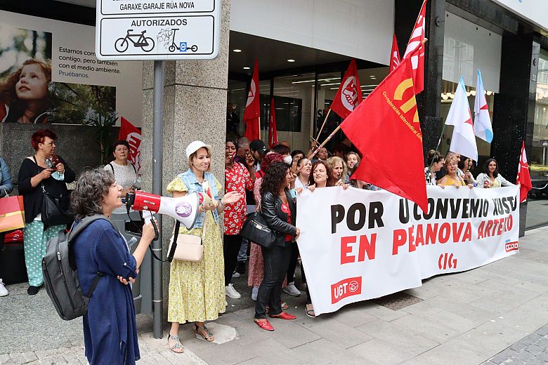 Traballadoras e traballadores de Pescanova Arteixo retomaron este xoves o calendario de mobilizacións para exixir un convenio colectivo digno, despois de que rematara sen acordo a reunión mantida o pasado martes coa dirección da empresa. Despois das concentracións realizadas diante do complexo industrial, nesta ocasións a protesta trasladouse á oficina principal de Abanca na Coruña, xa que esta entidade é propietaria do 98% do grupo Nueva Pescanova.