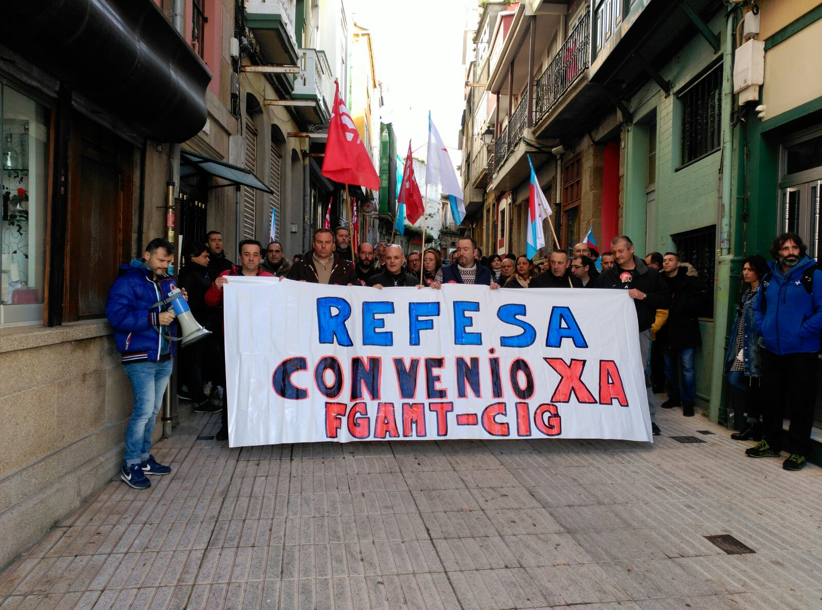 Traballadores de Refesa concentráronse este martes diante das oficinas da empresa para protestar polo bloqueo patronal na negociación do convenio colectivo. A mobilización enmárcase no calendario de accións acordadas polo persoal, entre as que se inclúe a convocatoria dunha folga se a empresa continúa co seu inmobilismo sen asumir ningunha mellora nos salarios e na regulación da xornada de embarque.