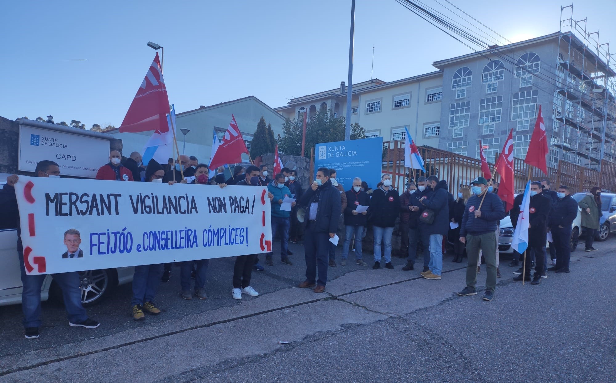O persoal encargado da seguridade do Centro de Atención de Persoas con Discapacidade (CAPD) de Redondela mobilizouse hoxe diante das instalacións situadas no Camiño do Gaio, en Chapela, convocado pola CIG-Servizos para reclamar o pago dos salarios pendentes. En concreto, a empresa adxudicataria deste servizo público dependente da Xunta, Mersant Vigilancia, adebédalle as nóminas de decembro de 2021 e de xaneiro deste ano.