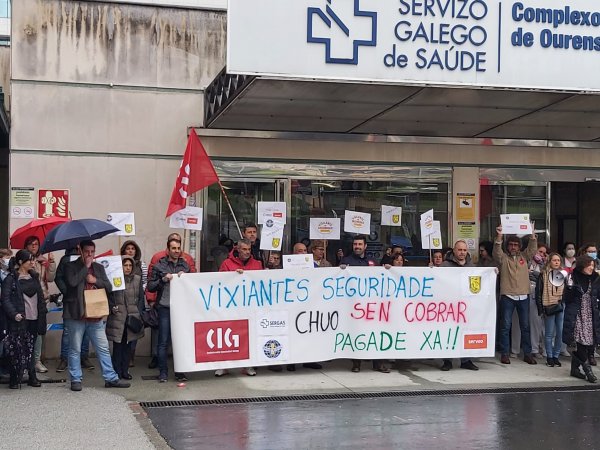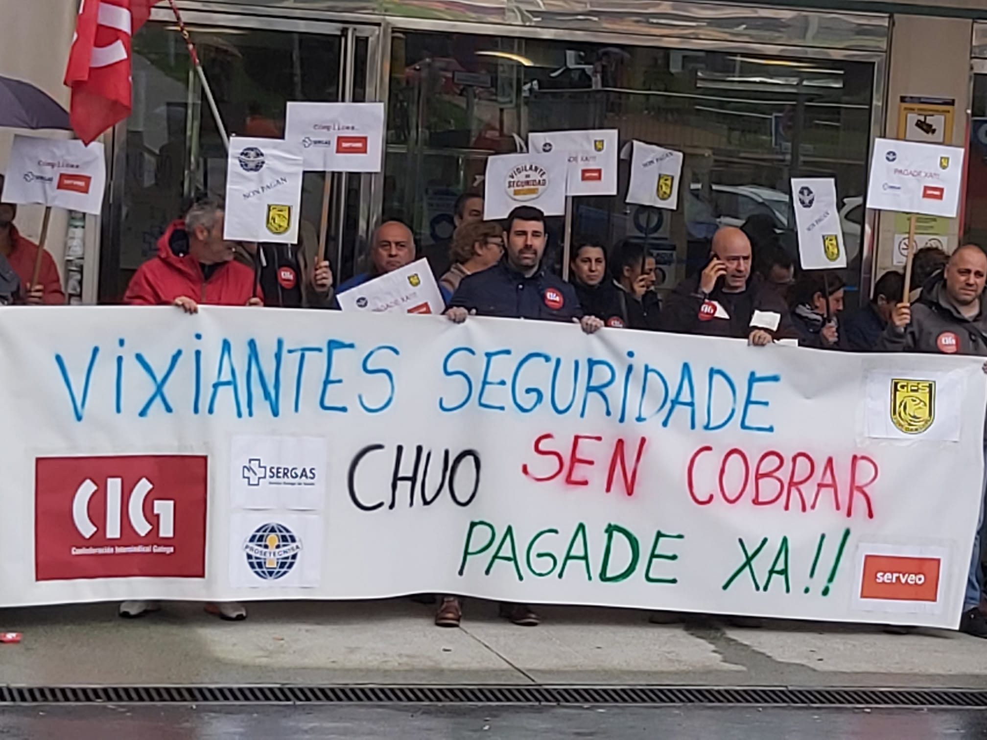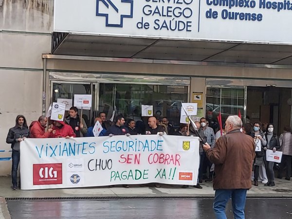 A concentración de hoxe tivo lugar de 10:00 a 10:30 horas ás portas do CHUO, onde se despregou unha faixa denunciando a situación na que se atopan os vixilantes de seguridade e se berraron consignas esixindo o pago dos soldos. Dende a CIG anuncian que as protestas continuarán nos vindeiros días e que se manterán até que os traballadores/as ingresen o salario pendente e o finiquito correspondente.