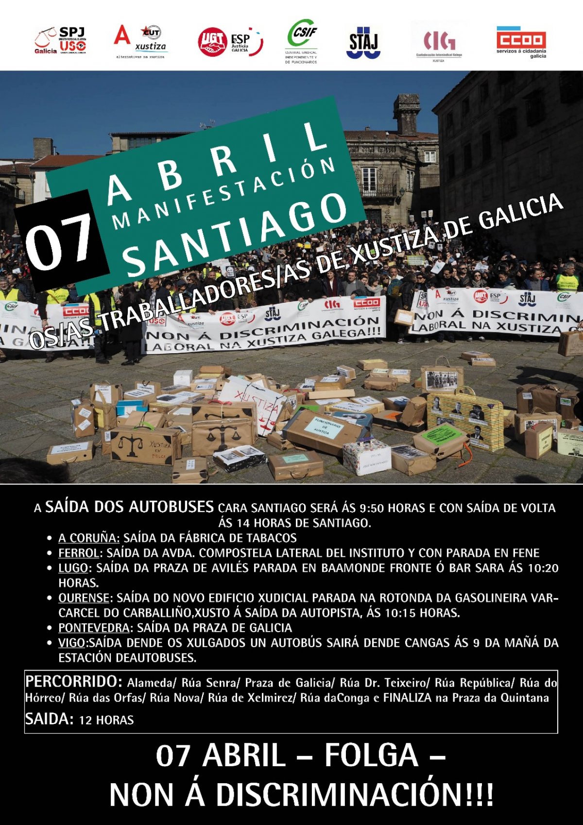O próximo sábado, 7 de abril, os traballadores e as traballadoras de xustiza volverán manifestarse polas rúas de Compostela, xusto cando se cumpren dous meses do inicio da folga indefinida para recuperar os dereitos roubados, esixir melloras laborais e reverter o recorte de emprego aplicado pola Xunta neste servizo público. Unha folga que está sendo un éxito dende o primeiro día, a pesar dos intentos da Xunta de desprestixiar esta loita e da estratexia de desgaste á que está a recorrer.