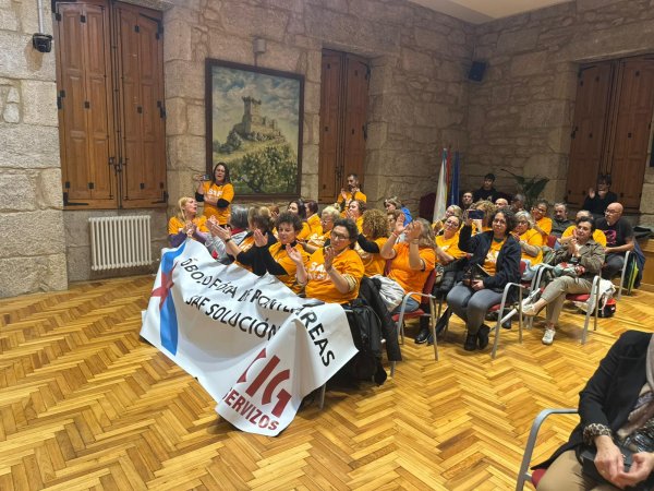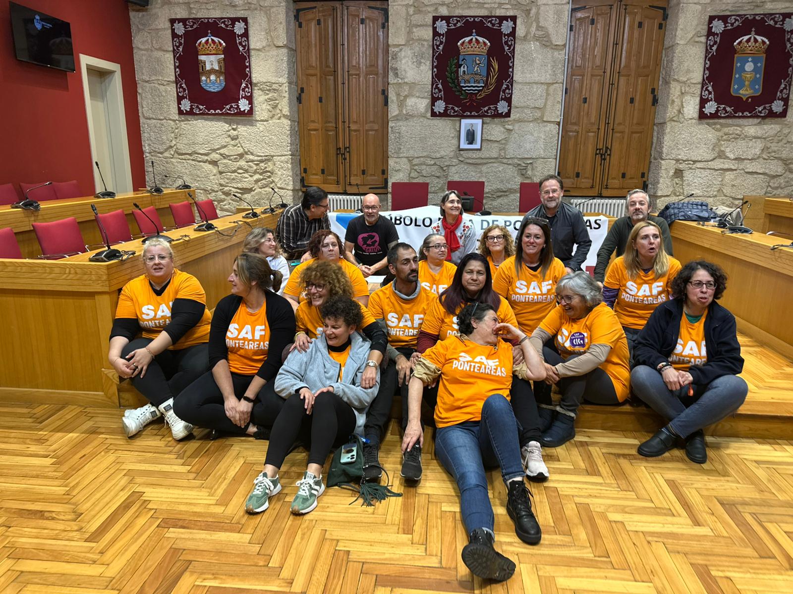 Un grupo de traballadoras e de responsábeis da CIG, entre eles o secretario xeral, Paulo Carril, e a secretaria comarcal da CIG-Servizos de Vigo, Transi Fernández, accederon ao consistorio para trasladar as reivindicacións das afectadas durante o pleno da corporación como xa se fixo con anterioridade: que se abonen as nóminas a tempo e que se paguen as horas traballadas, así como medidas de prevención, contratos a tempo completo e que se garantan os descansos legais mínimos, tanto diarios como semanais, entre outras cousas.
