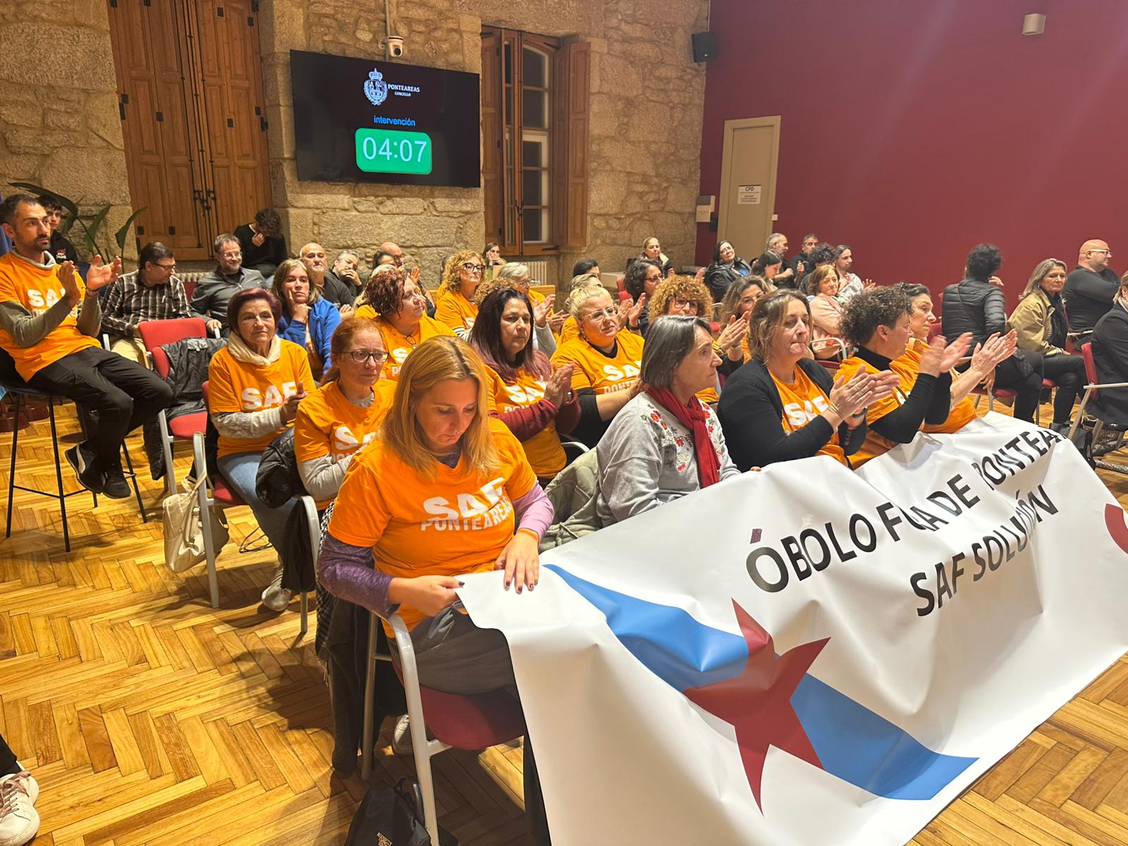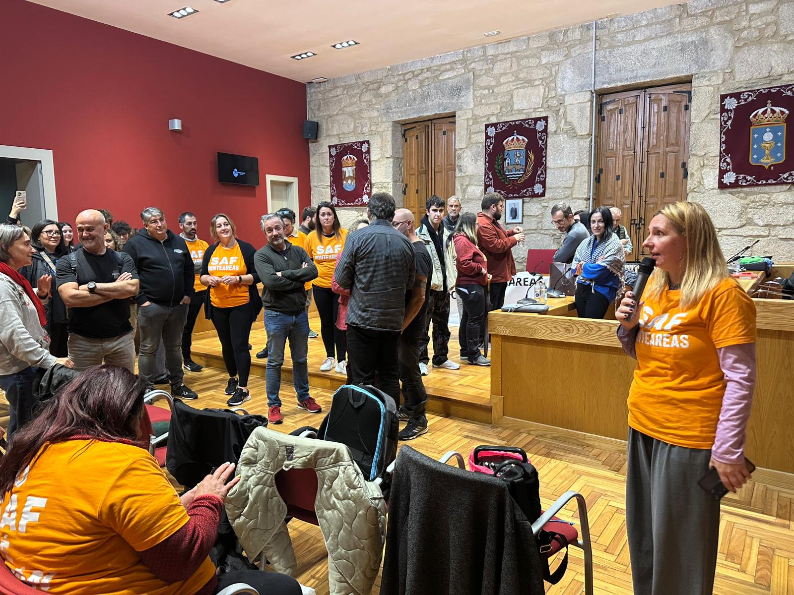 Xa preto da medianoite interveu unha representante das traballadoras, que criticou tanto a xestión do Goberno local como a actitude dos dirixentes municipais, que hoxe se limitaron a levar ao pleno unha proposta de sanción para a empresa tras constatar distintos incumprimentos do contrato. En canto á posibilidade de rescindille o contrato, o concelleiro responsábel escudouse no feito de que aínda que se fixese a empresa podería volver a prensentarse ao concurso e gañalo. Estas afirmacións, e alocución final da alcaldesa, Nava Castro, acusando as empregadas do SAF de falta de sensibilidade coas persoas usuarias do servizo encenderon os ánimos das persoas presentes, que interromperon a sesión ao berro de "Empresa culpable, Nava responsable". Tras o que a rexedora deu por suspendido o pleno ao superarse a medianoite.