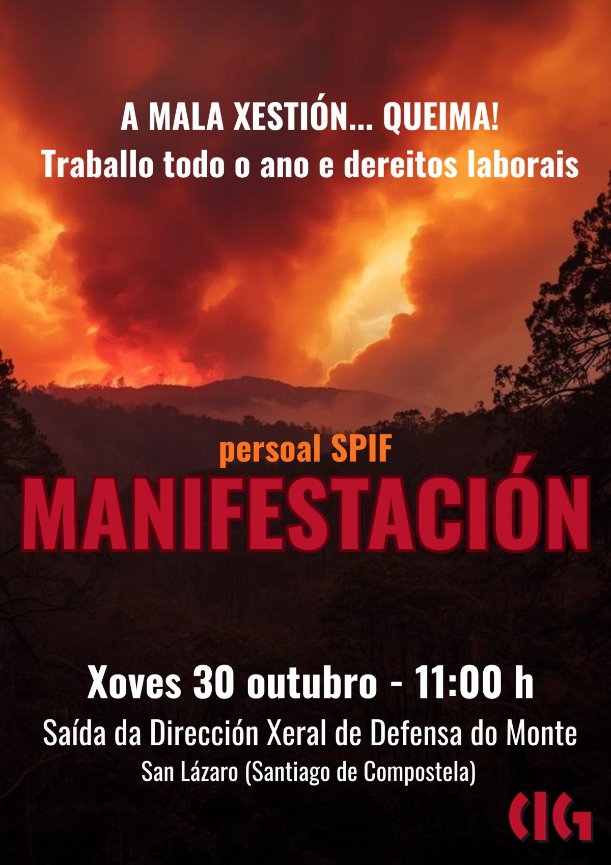 O persoal do Servizo de Prevención e Defensa contra Incendios Forestais (SPIF) manifestarase o vindeiro xoves, 30 de outubro, polas rúas de Compostela para reclamar un servizo de incendios público, digno e con garantías laborais. A mobilización, convocada pola CIG-Administración Autonómica, sairá ás 11 horas da Consellaría de Medio Rural en San Lázaro e rematará diante do complexo da Xunta en San Caetano.