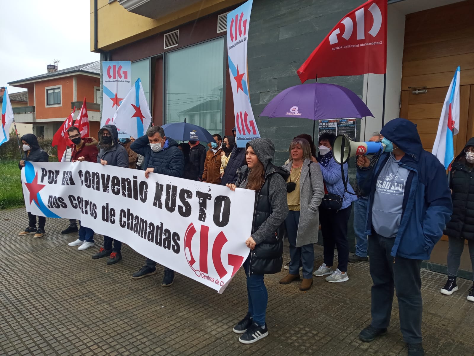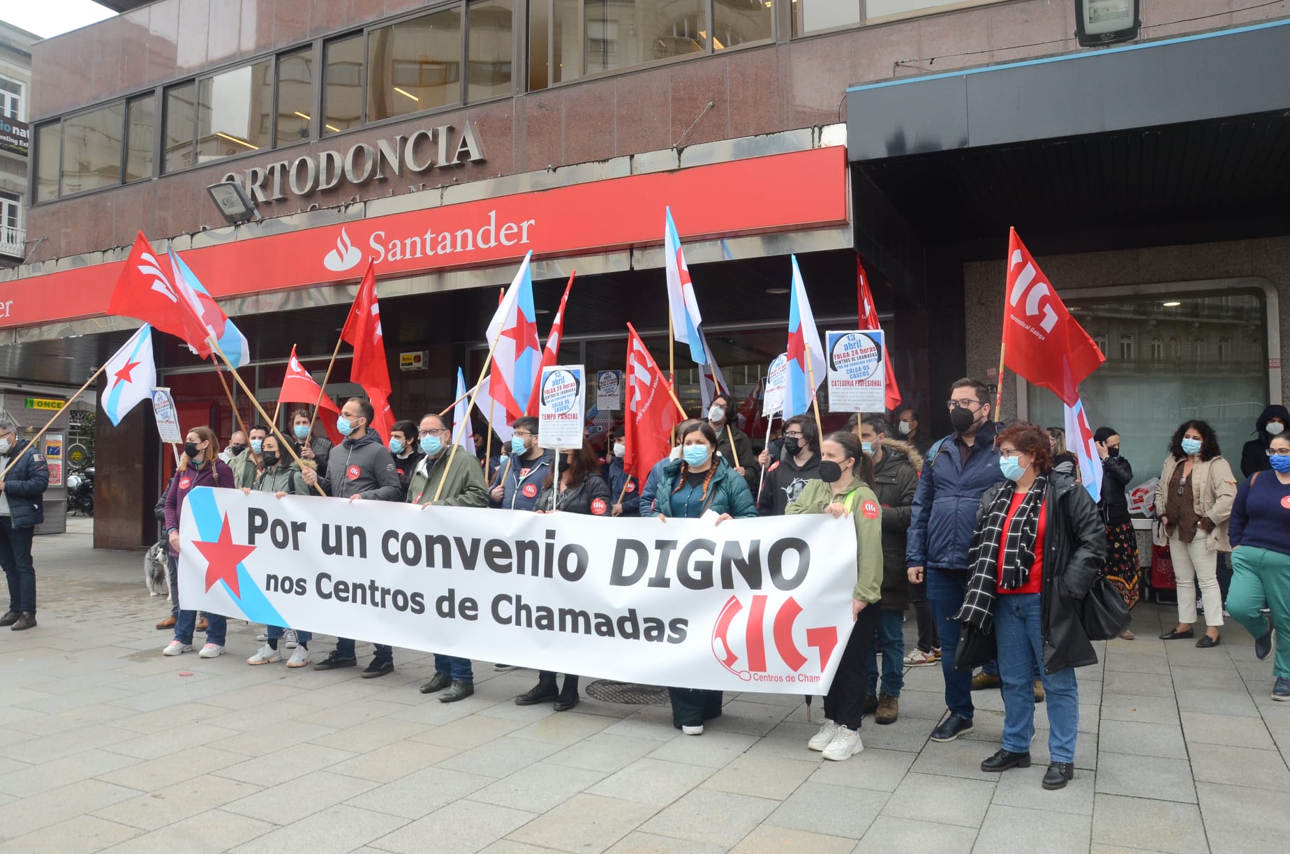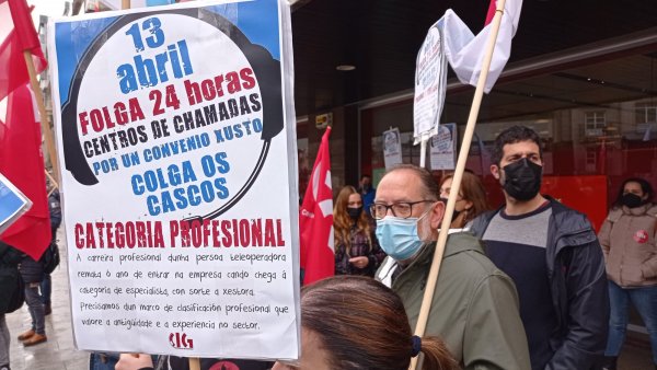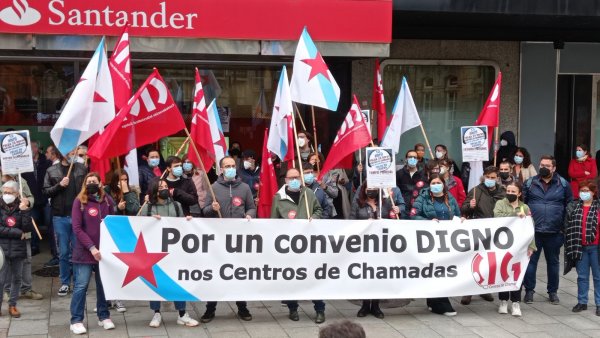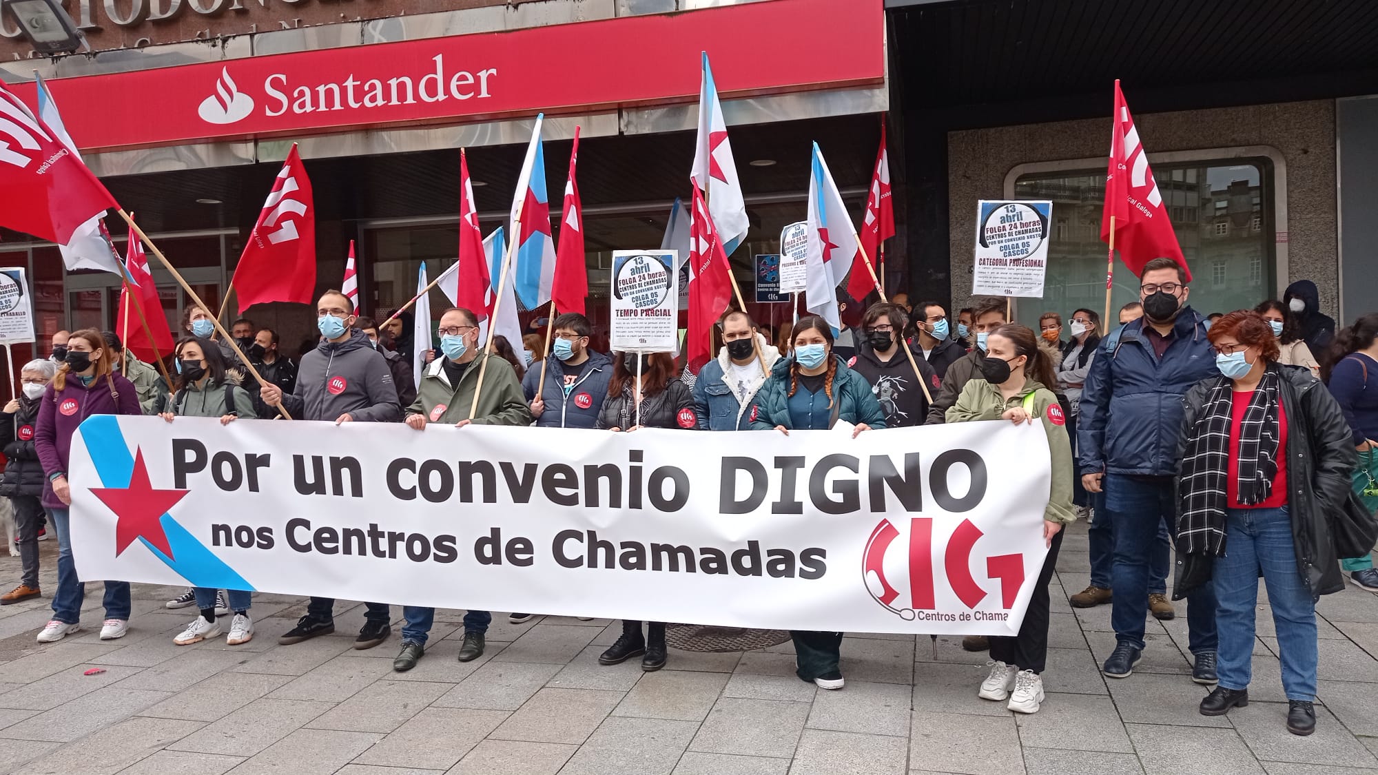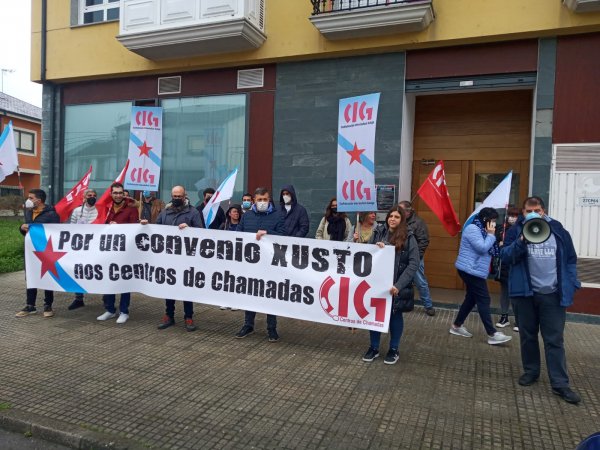 Traballadoras e traballadores dos centros de chamadas de Galiza están secundando este mércores unha xornada de folga, convocada pola CIG, para esixir un convenio colectivo xusto, que dignifique as condicións laborais e salariais do sector. Con motivo do paro, realizáronse concentracións en Vigo, A Coruña, A Estrada e Sarria nas que se denunciaron as propostas de precariedade formuladas pola da patronal que, tras dous anos de negociación, non só se nega a aplicar unha suba que garanta a recuperación do poder adquisitivo dos salarios, senón que incluso pretende recortar dereitos xa consolidados.