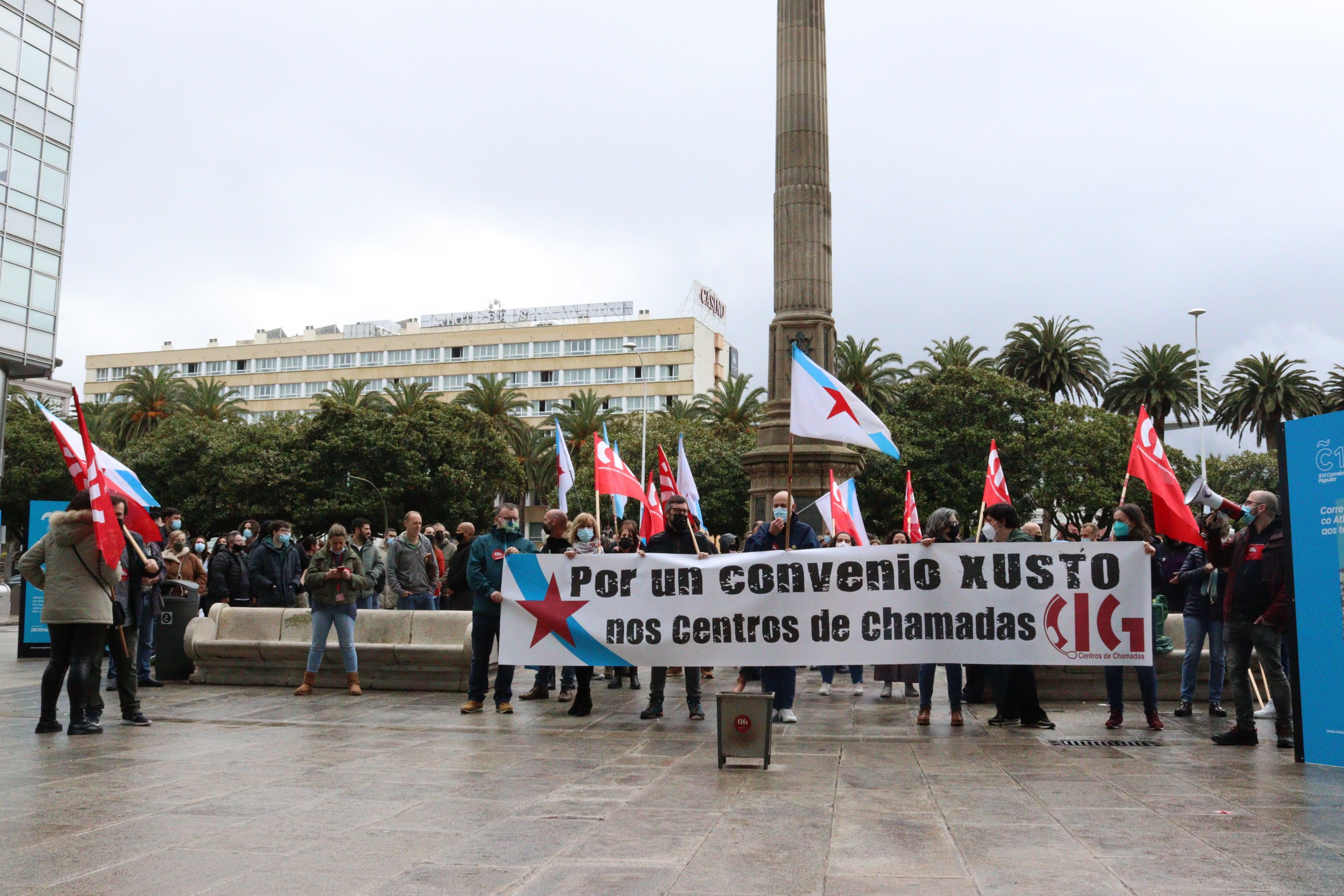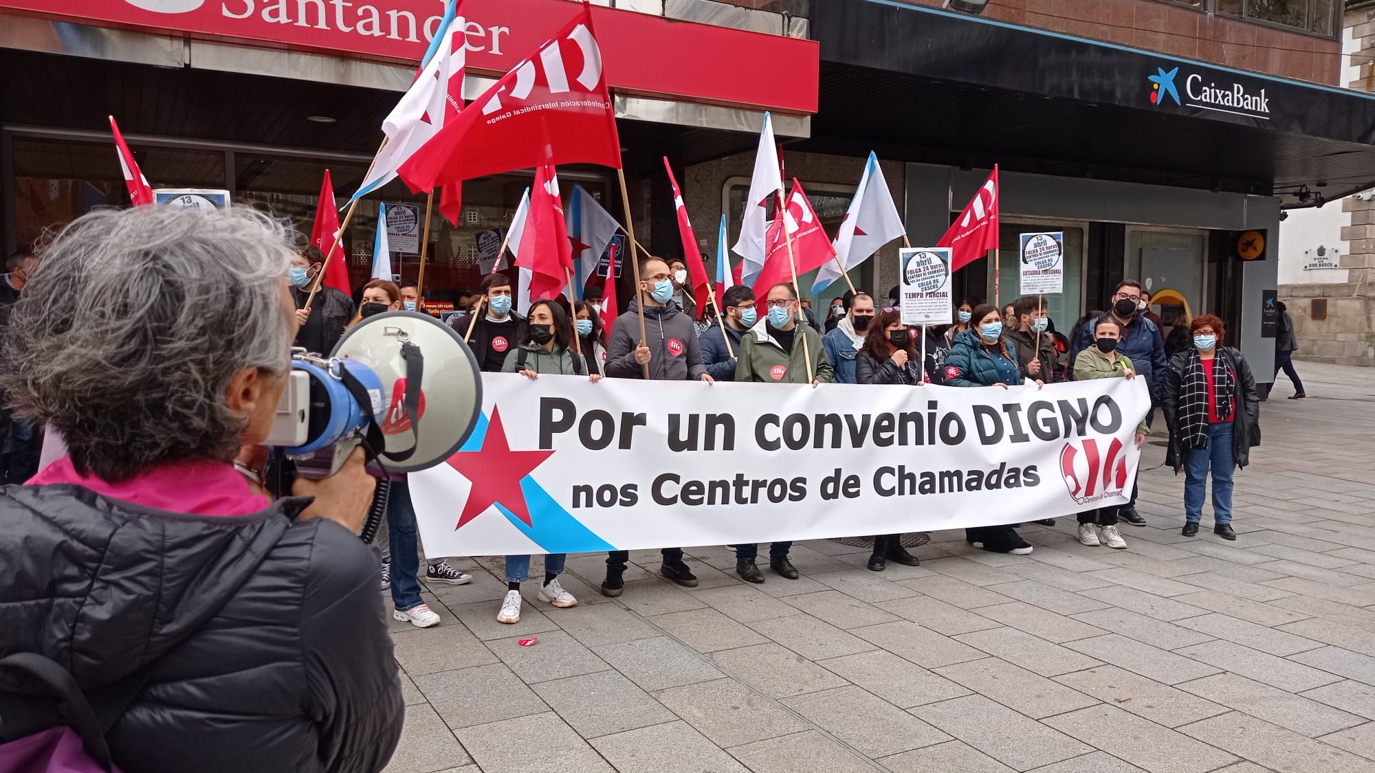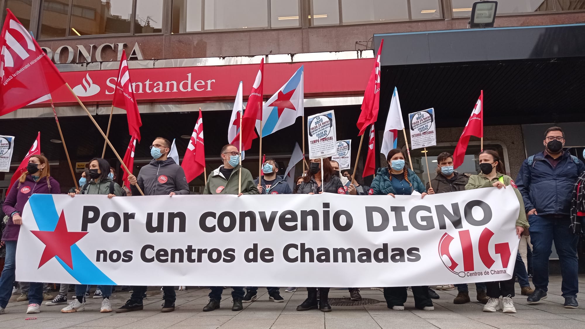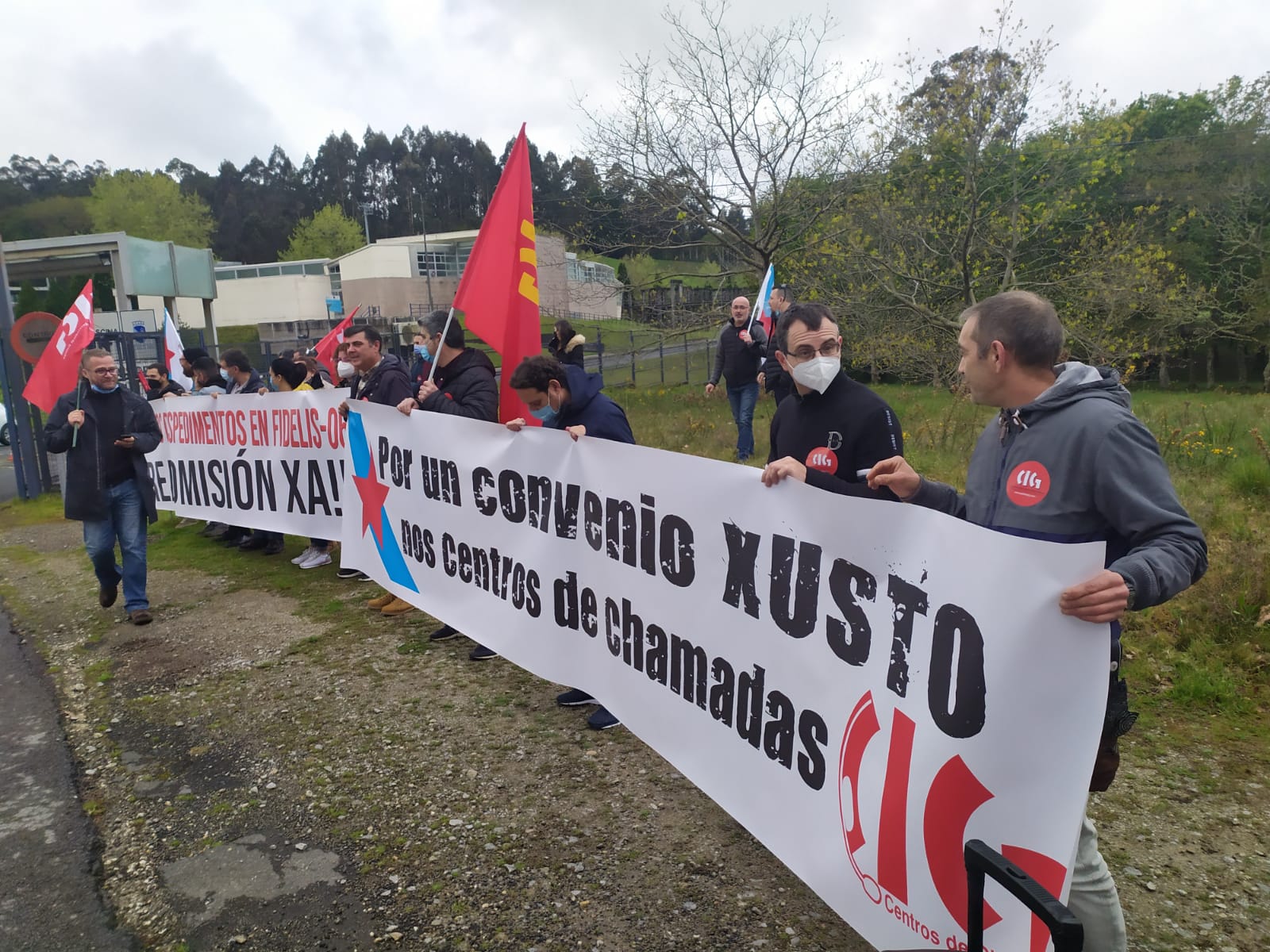 Traballadoras e traballadores dos centros de chamadas de Galiza están secundando este mércores unha xornada de folga, convocada pola CIG, para esixir un convenio colectivo xusto, que dignifique as condicións laborais e salariais do sector. Con motivo do paro, realizáronse concentracións en Vigo, A Coruña, A Estrada e Sarria nas que se denunciaron as propostas de precariedade formuladas pola da patronal que, tras dous anos de negociación, non só se nega a aplicar unha suba que garanta a recuperación do poder adquisitivo dos salarios, senón que incluso pretende recortar dereitos xa consolidados.