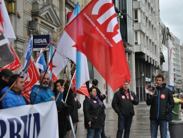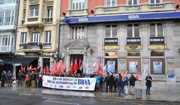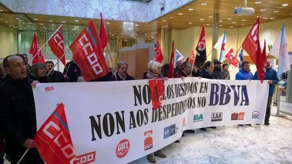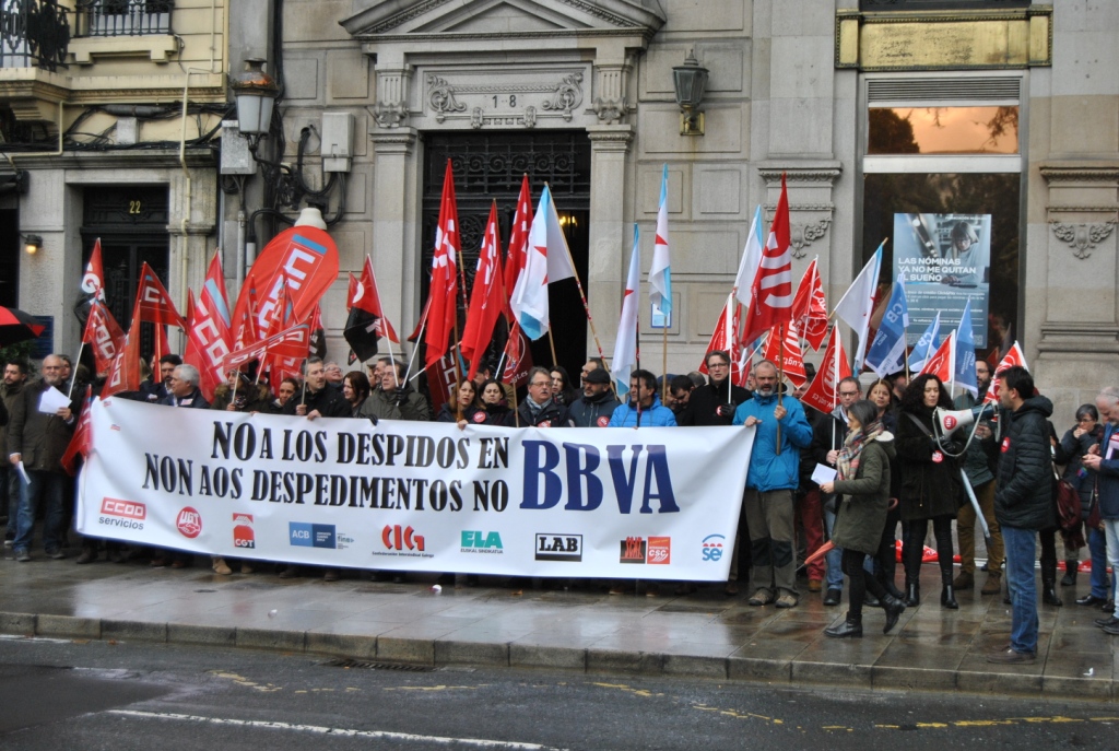 Durante a protesta, o Secretario da Sección Sindical da CIG no BBVA, Miguel Fernández, explicou que dende xuño do ano pasado houbo máis de 50 despedimentos na entidade, aos que hai que sumar un número indeterminado de baixas "aparentemente voluntarias" e excedencias “forzadas”. Estes despedimentos, denuncia, "non teñen ningunha base. A empresa alega unha baixada voluntaria da produtividade, pero logo, para evitar ir a xuízo recoñece a improcedencia".