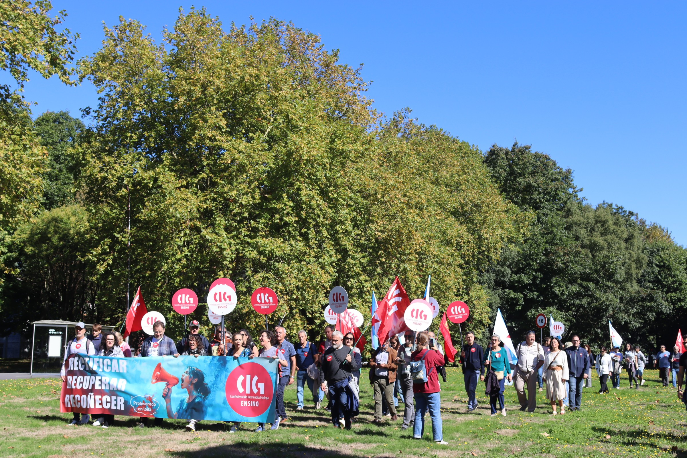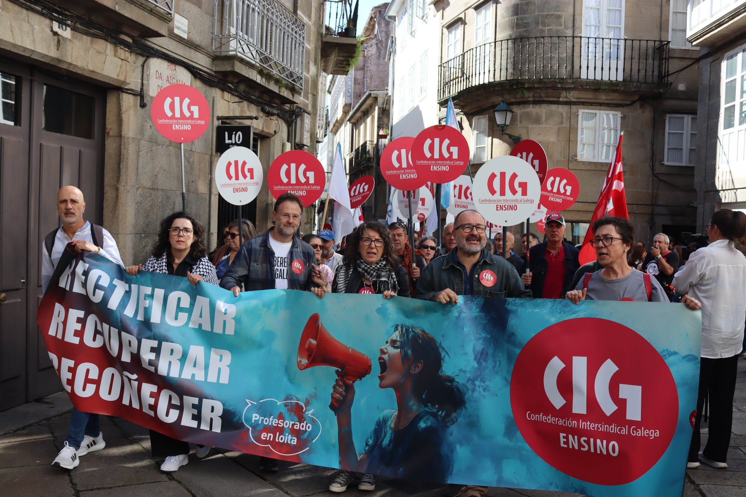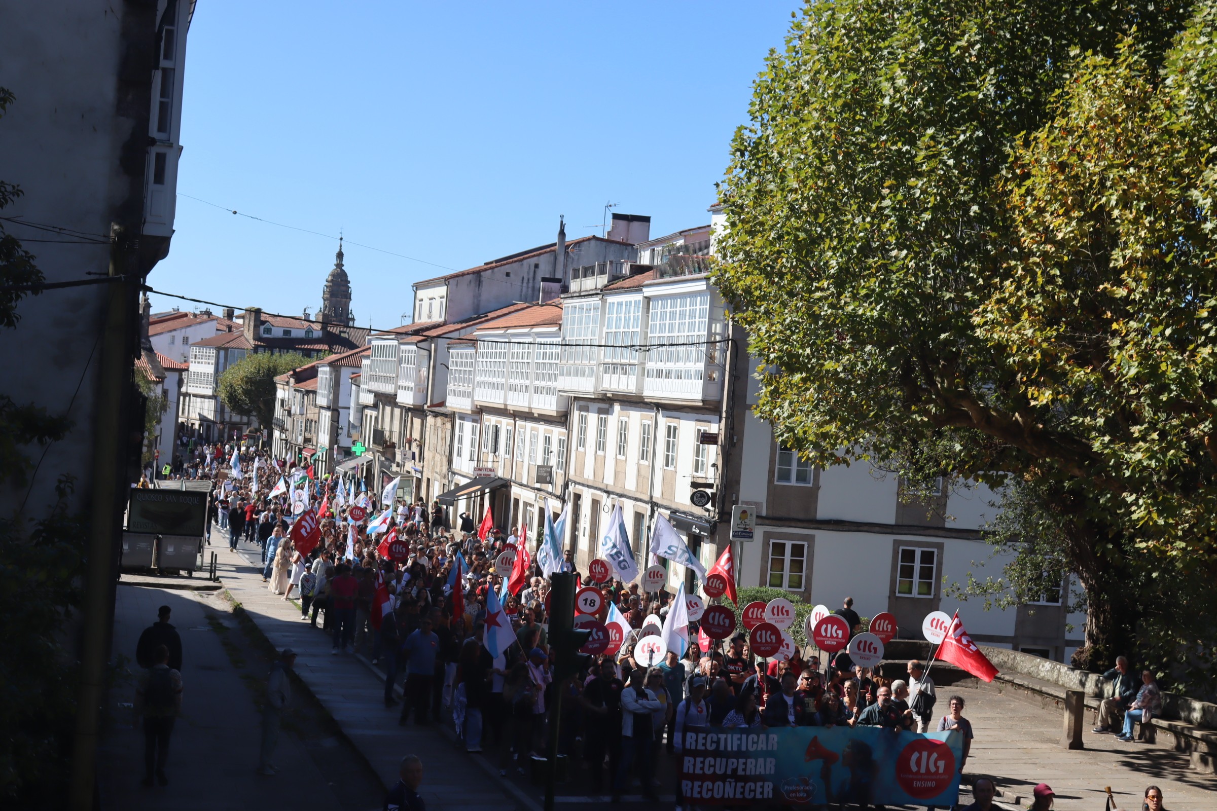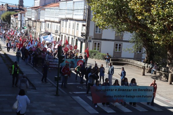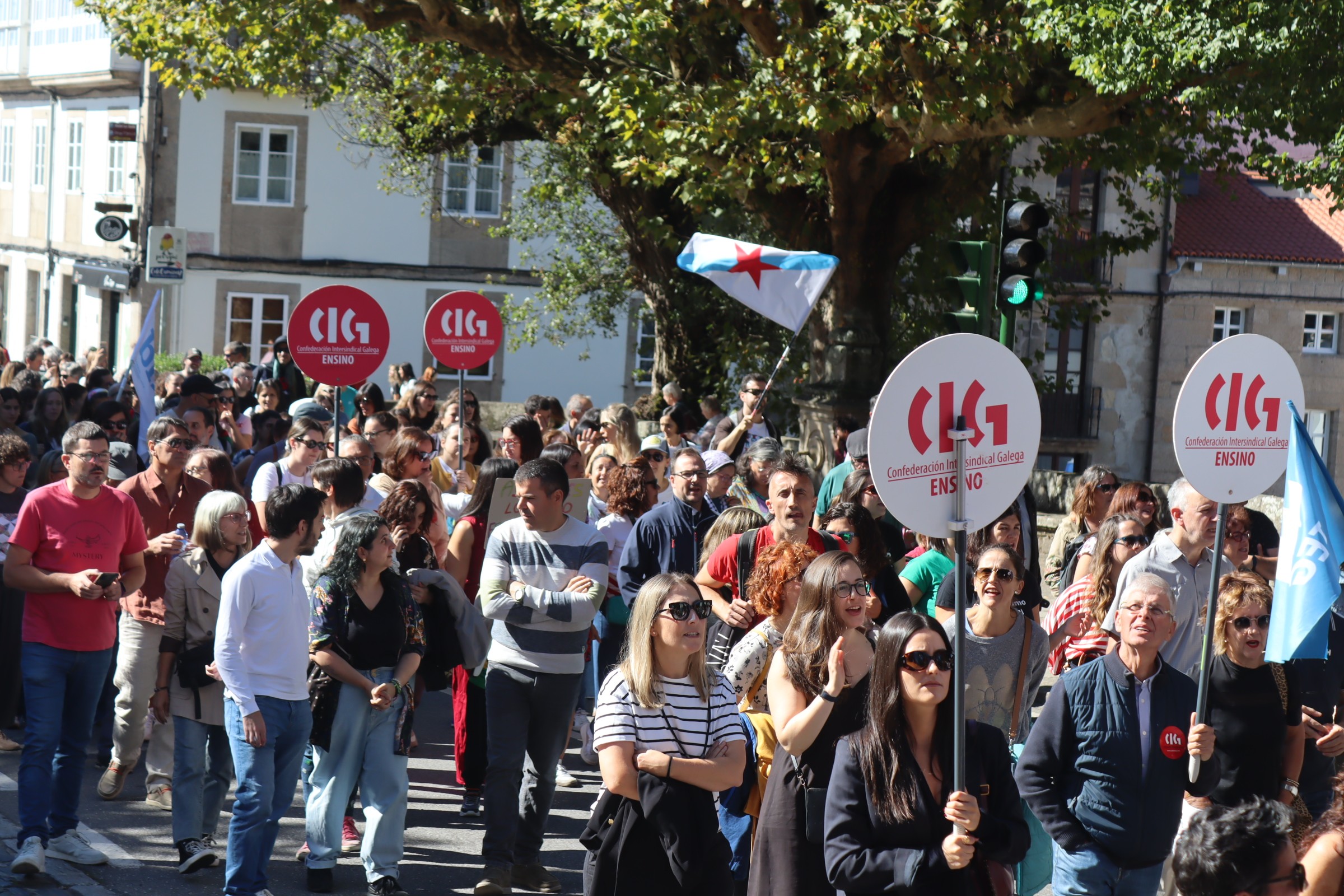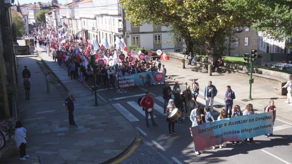 A manifestación partiu a mediodía desde a compostelá Praza de Cervantes para rematar diante da consellaría de Educación, no edificio administrativo de San Caetano. Con esta mobilización o ensino non universitario reclamaba, máis unha vez, a recuperación de dereitos, nomeadamente o horario lectivo recortado desde os anos 2011 e 2012, nos que se subiron a 25 horas en infantil e primaria e a 20 no resto de ensinanzas, respectivamente.