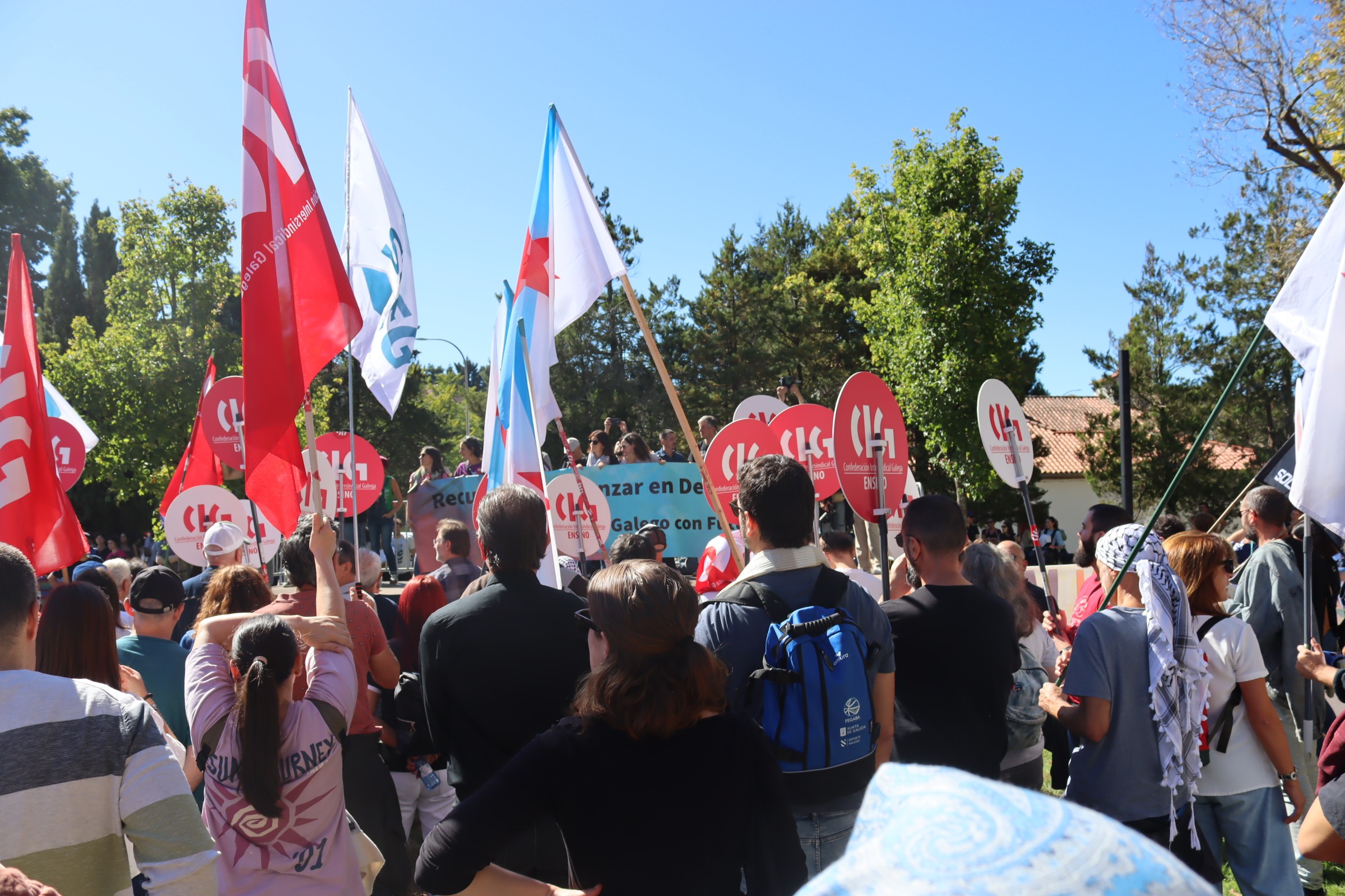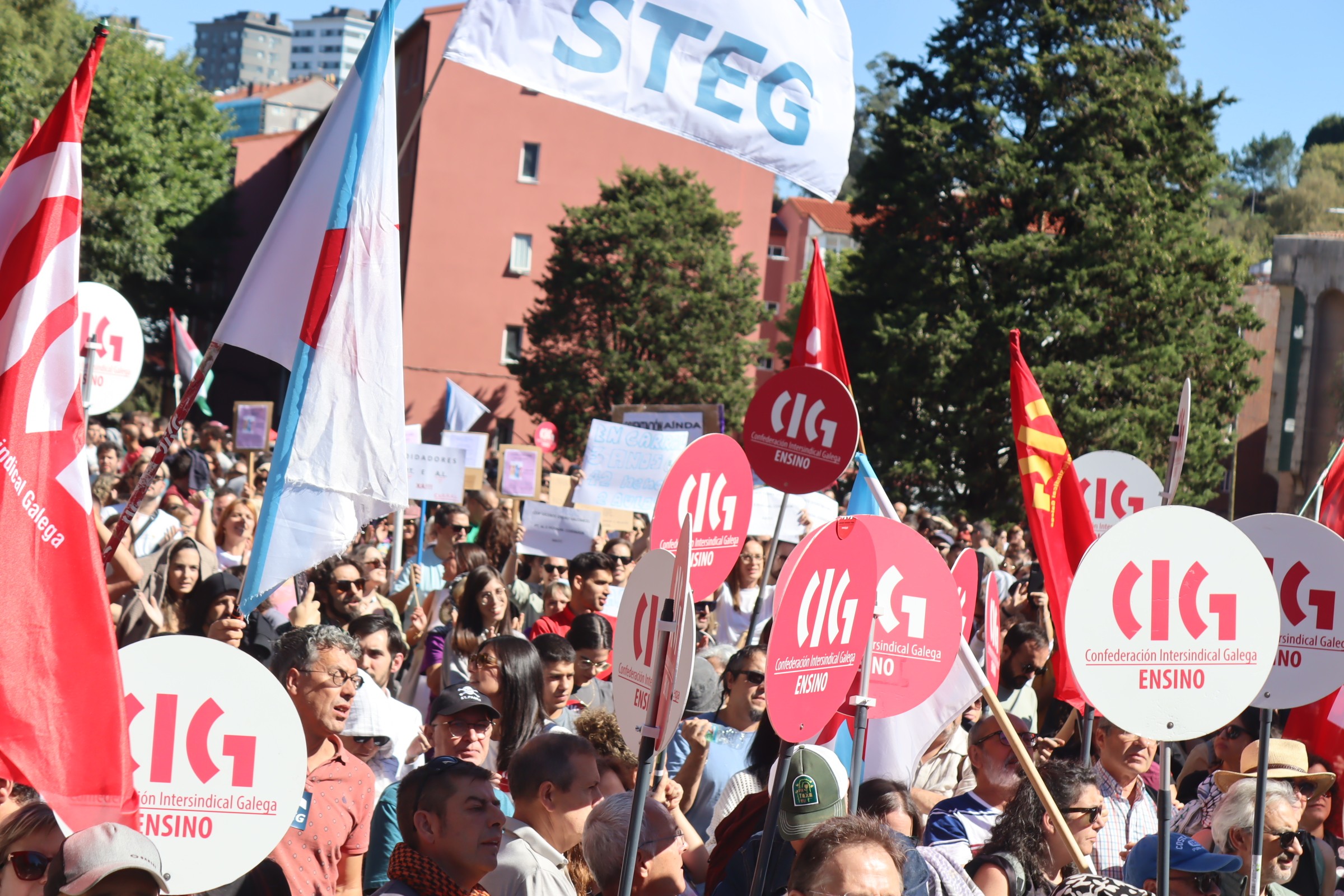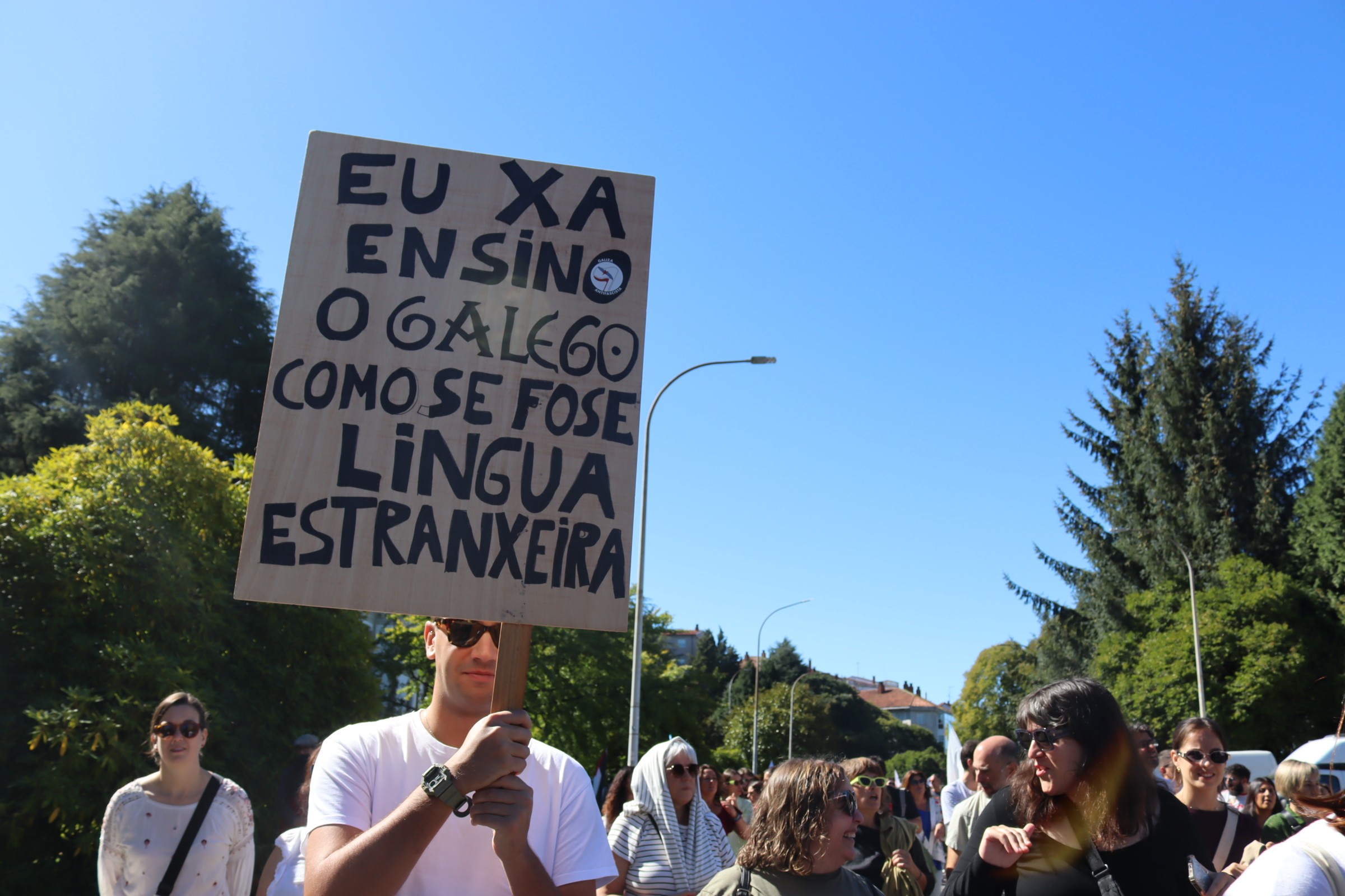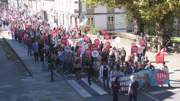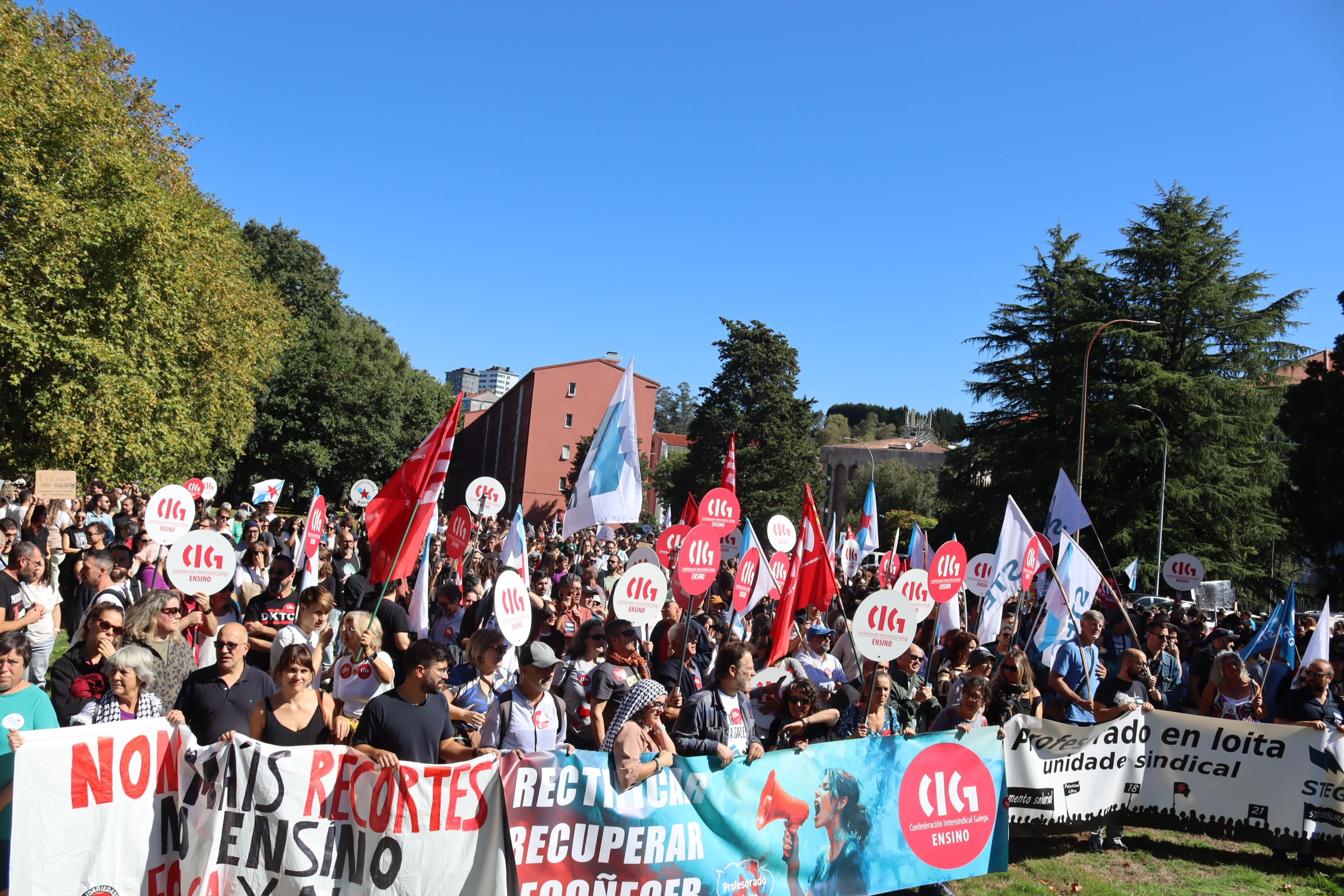 A manifestación partiu a mediodía desde a compostelá Praza de Cervantes para rematar diante da consellaría de Educación, no edificio administrativo de San Caetano. Con esta mobilización o ensino non universitario reclamaba, máis unha vez, a recuperación de dereitos, nomeadamente o horario lectivo recortado desde os anos 2011 e 2012, nos que se subiron a 25 horas en infantil e primaria e a 20 no resto de ensinanzas, respectivamente.