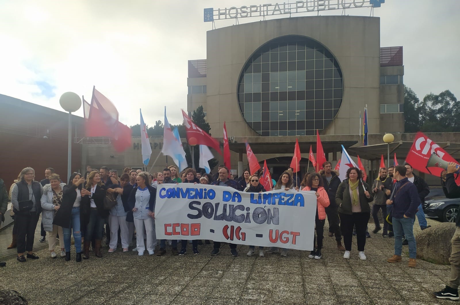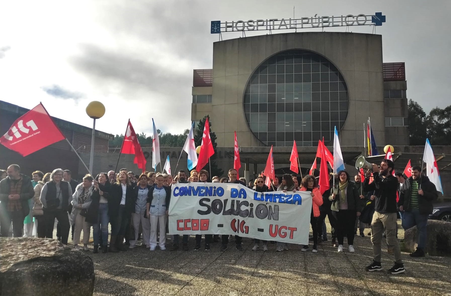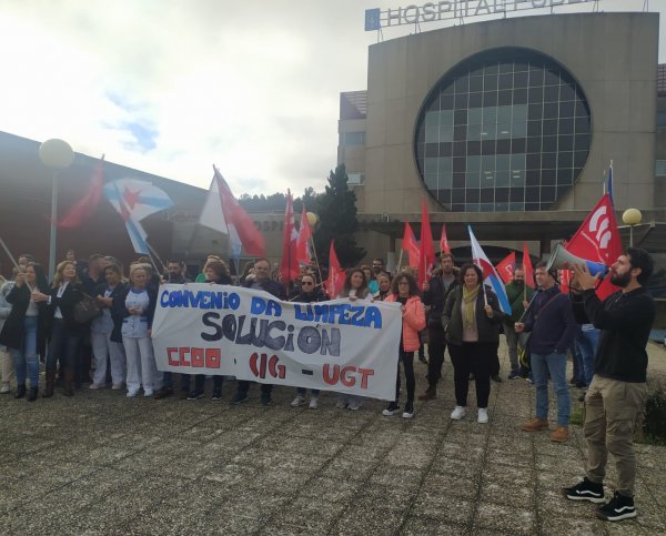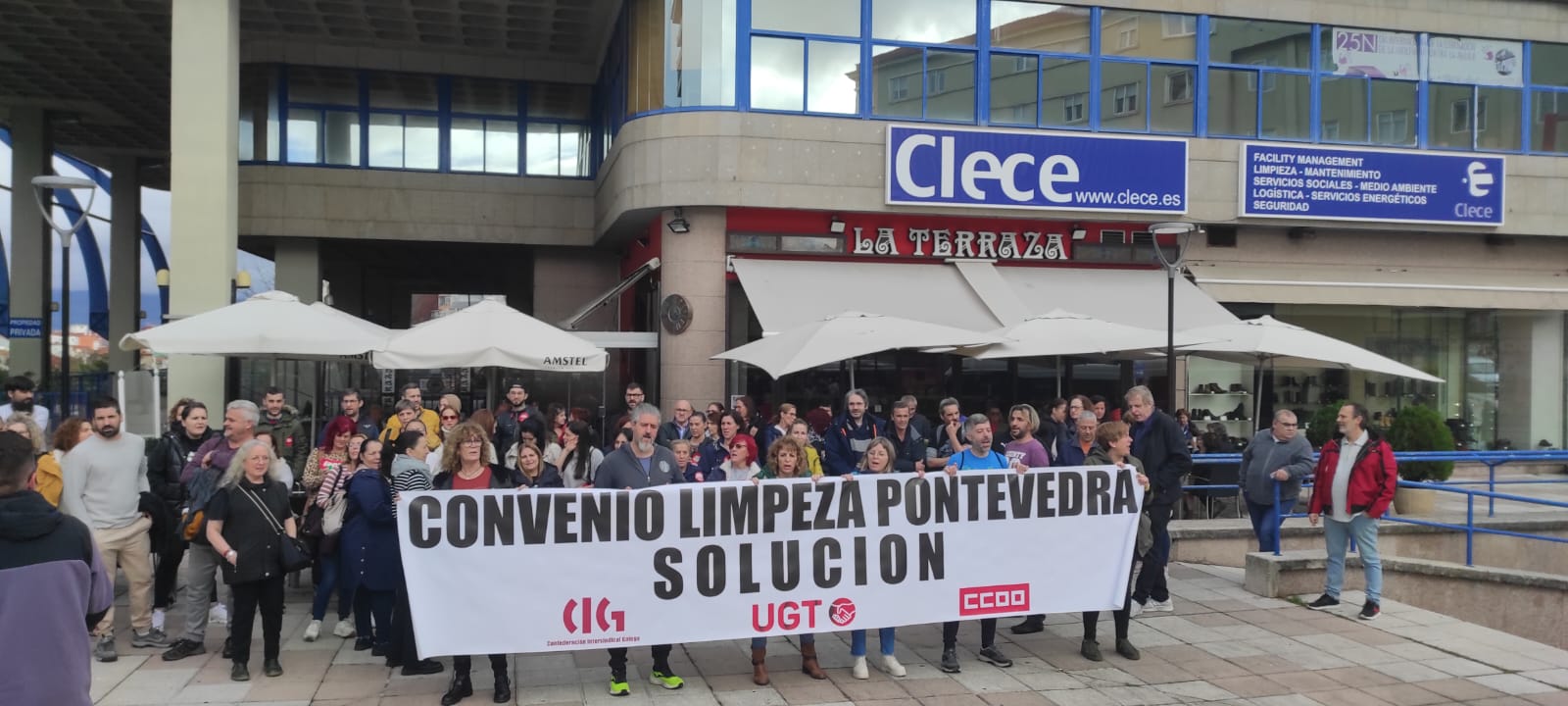 As traballadoras/es do sector da limpeza de edificios e locais da provincia de Pontevedra volveron reclamar hoxe na rúa unha mellora das condicións laborais ao berro de “convenio digno, convenio xa!”. Nas mobilizacións que se desenvolveron diante da sede da empresa Clece en Vigo ao mediodía e do hospital do Salnés ás 11:00 horas tamén lle trasladaron toda a súa solidariedade ás compañeiras/os de Lugo que se atopan folga indefinida pola negativa da patronal a incrementar uns salarios que están por debaixo do SMI.