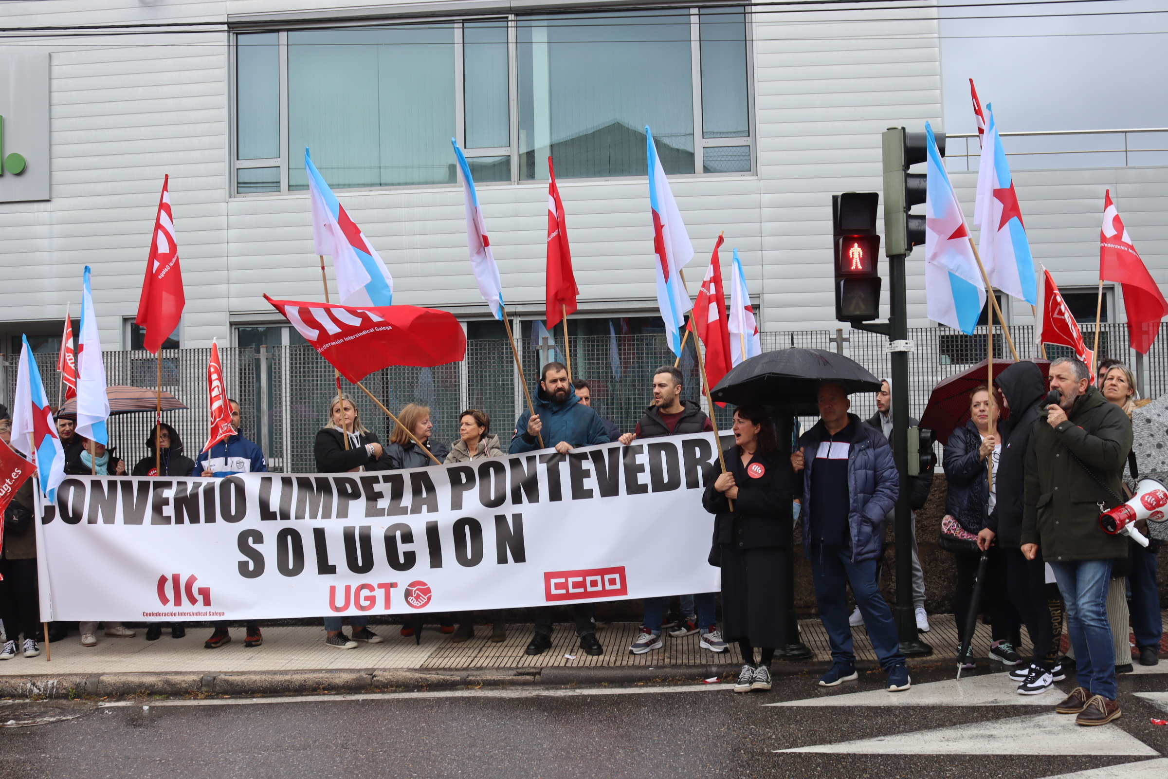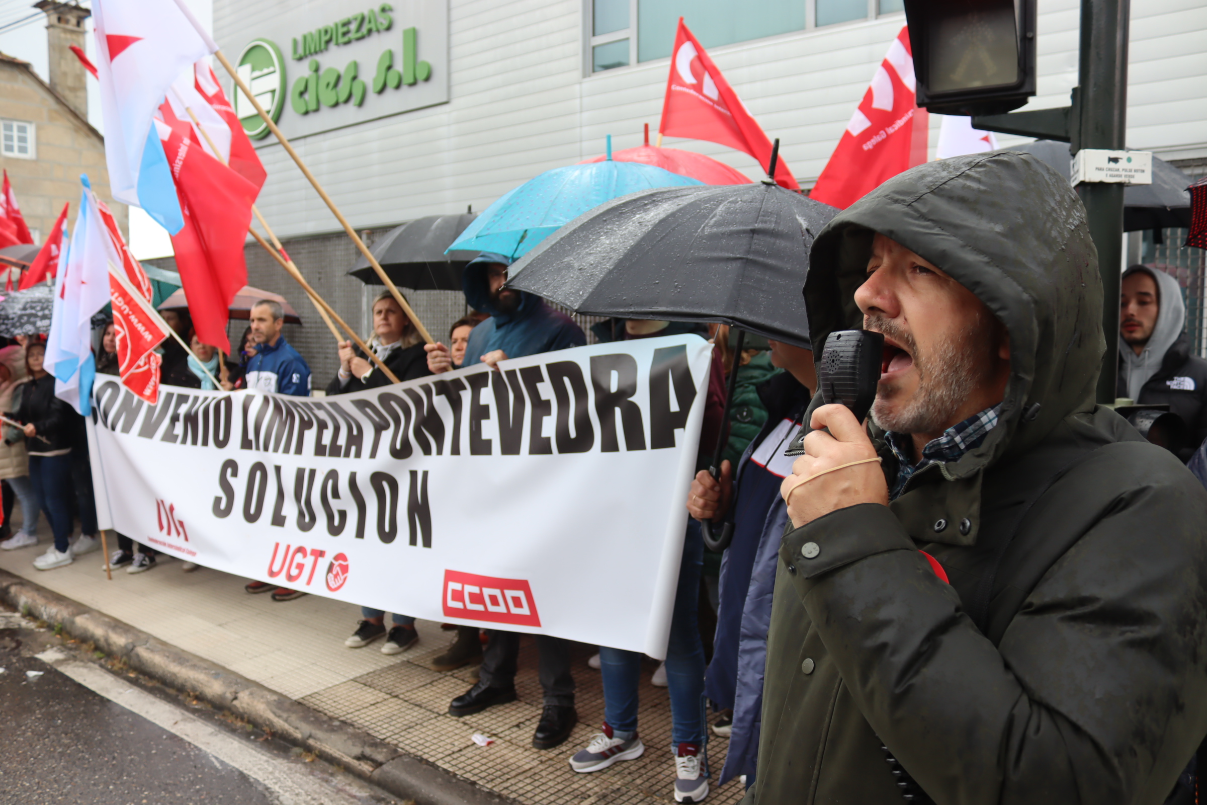 Máis dun cento de traballadoras/es da limpeza de edificios e locais da provincia de Pontevedra desenvolveron hoxe unha mobilización diante de Limpiezas Cíes en Coruxo convocadas/es pola CIG, CCOO e UGT para reclamar unhas condicións laborais dignas e denunciar o bloqueo das negociación do convenio colectivo por parte da patronal.