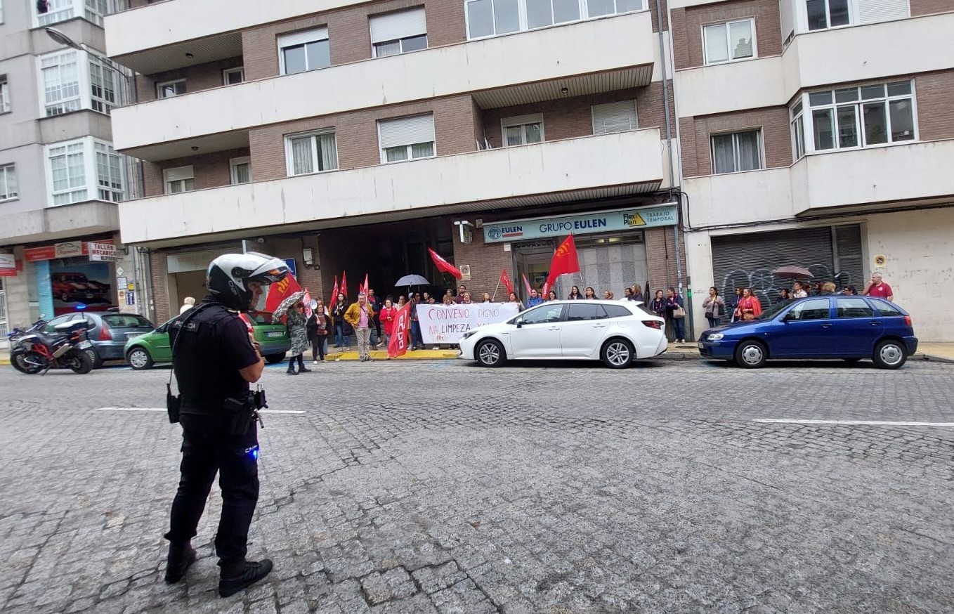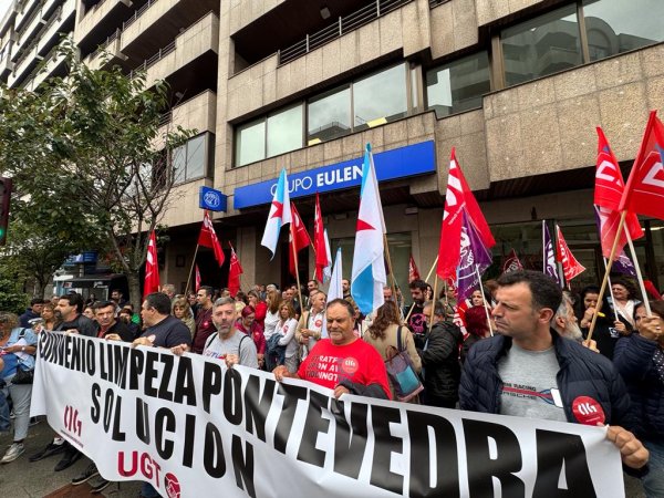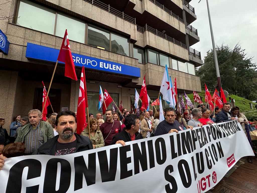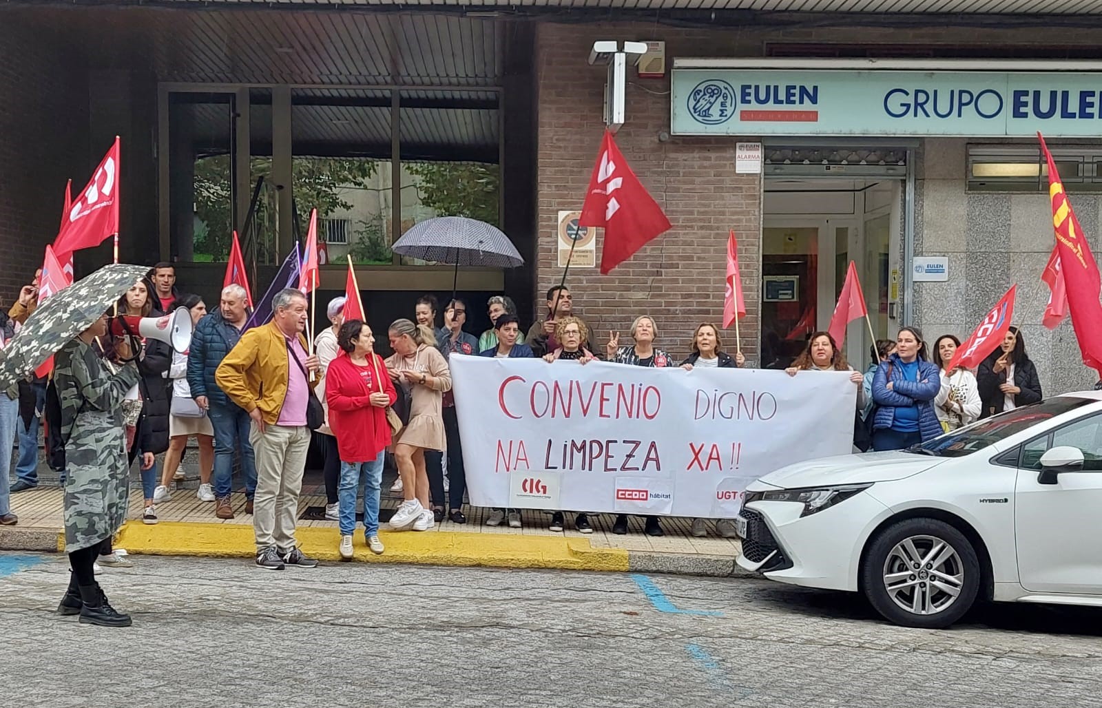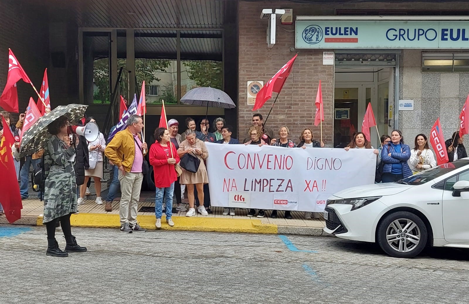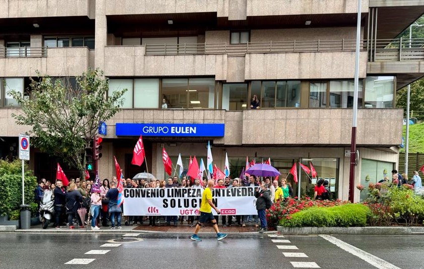 O sector da limpeza de edificios e locais de Pontevedra e Ourense mobilizouse hoxe para denunciar a paralización da negociación dos convenio colectivos provinciais ante a negativa do empresariado a pactar unha suba salarial digna. Un nutrido grupo de traballadoras/es desenvolveu concentracións diante das sedes de Eulen (empresa que fai parte da asociación patronal que se senta na mesa) en Vigo e Ourense ao berro de “convenio solución”.