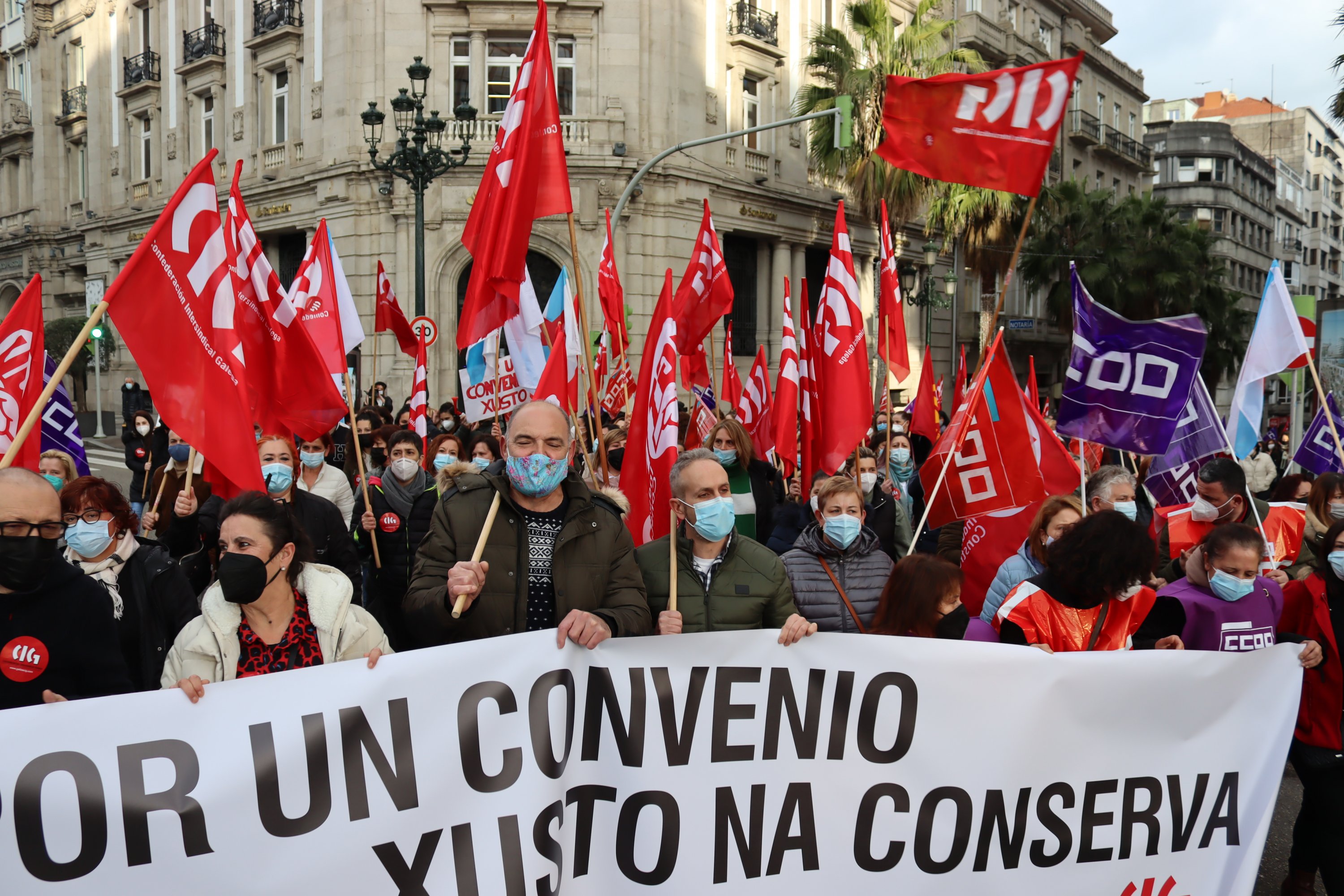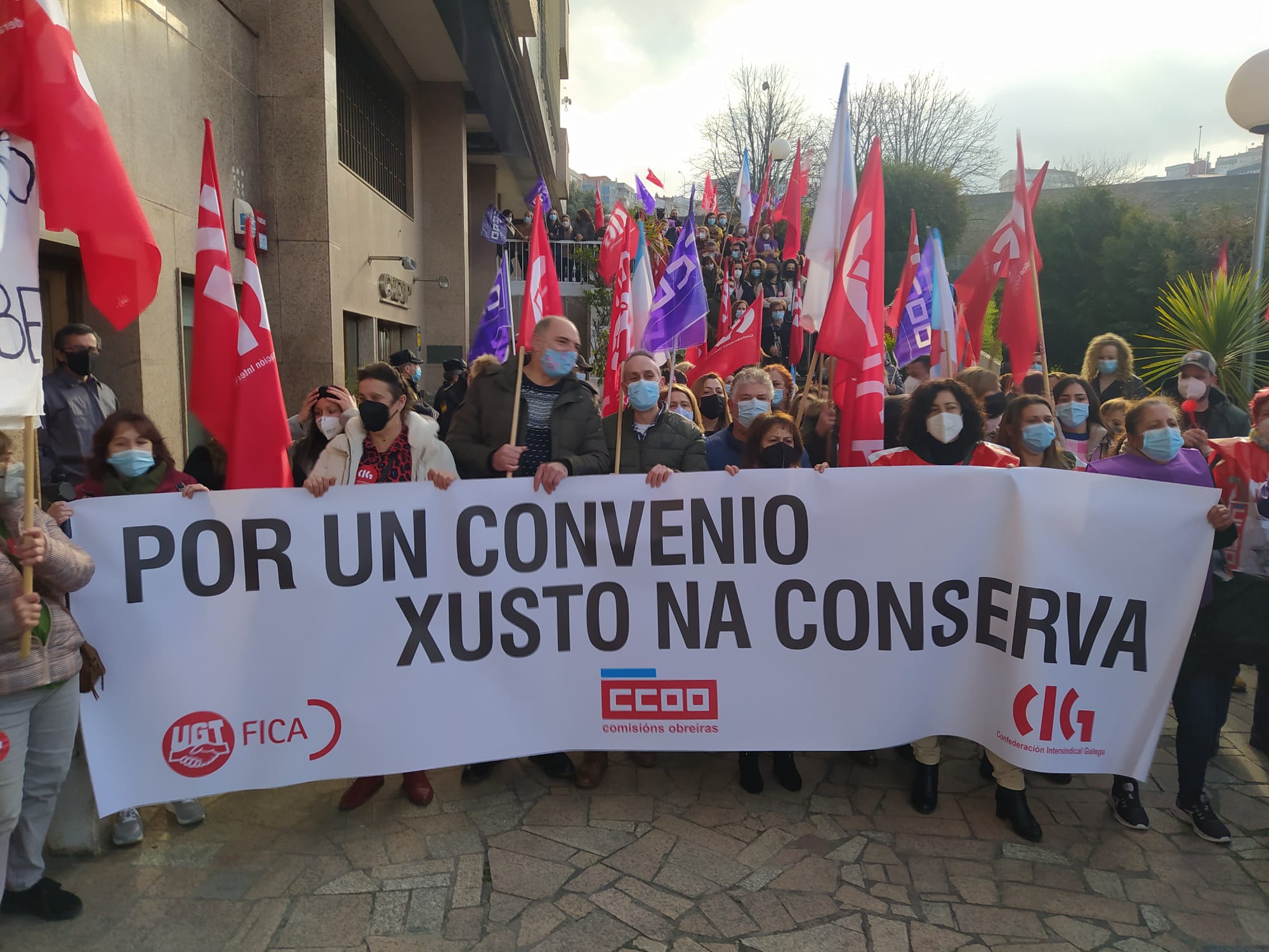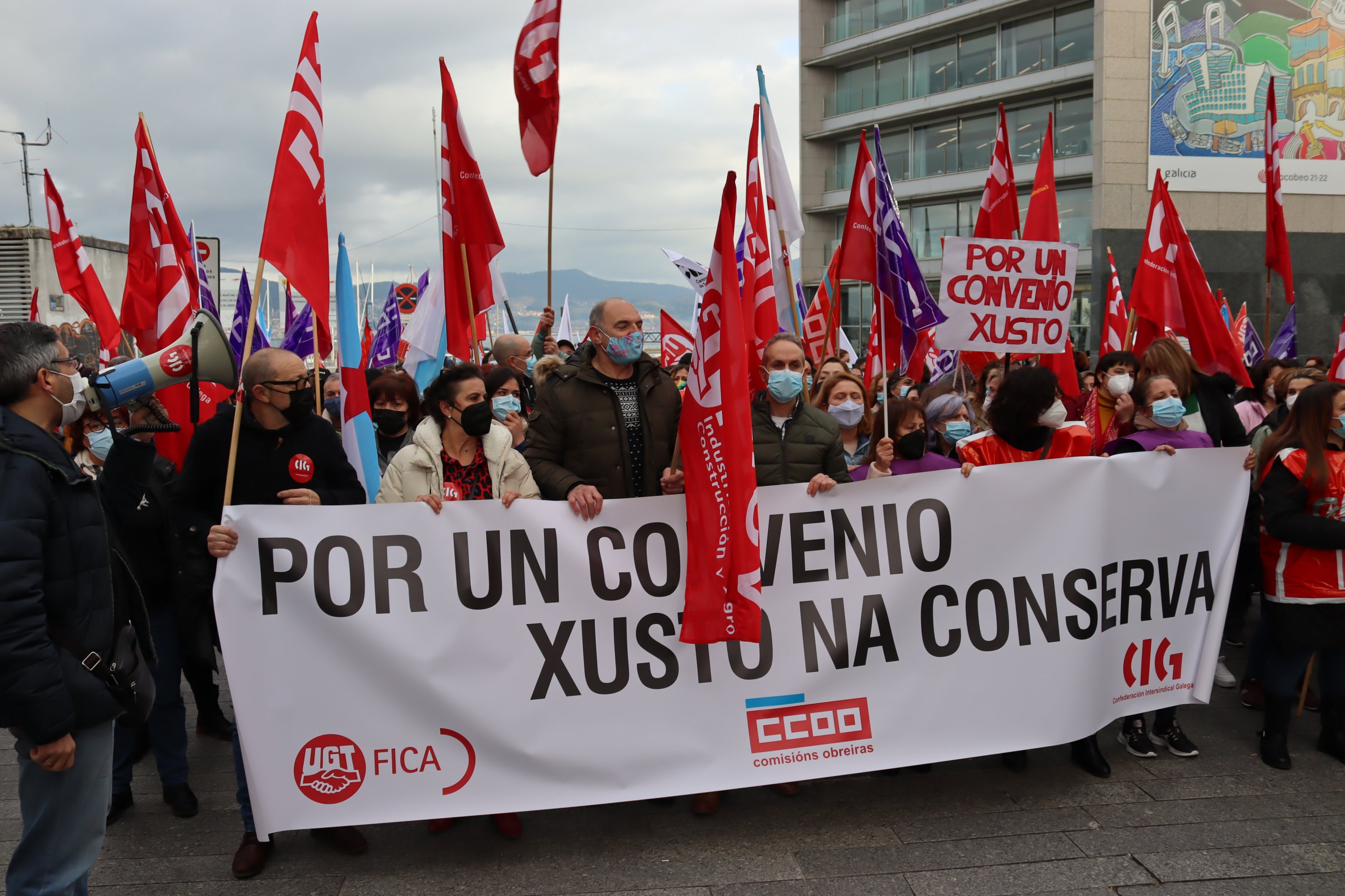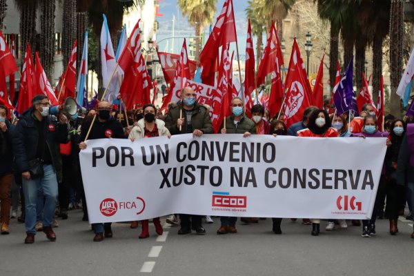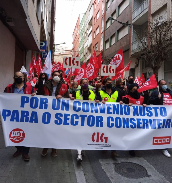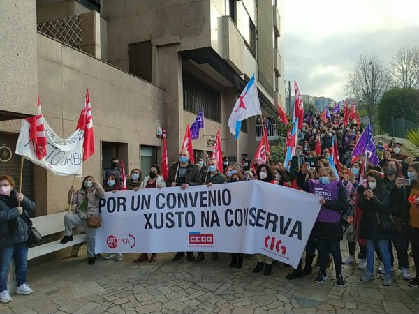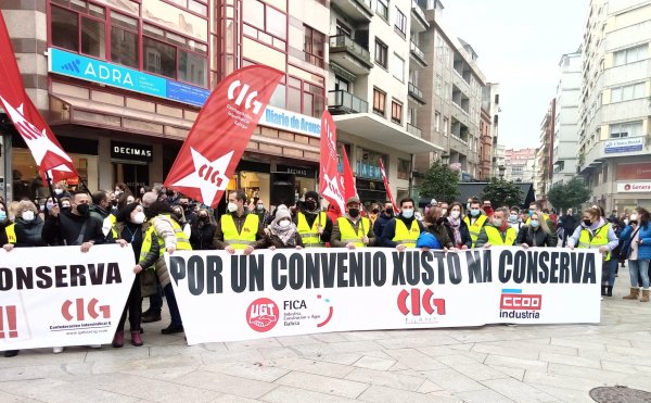 O persoal do sector das conservas de peixe deu hoxe unha novo exemplo da súa capacidade de loita e secundou de forma masiva a segunda xornada de folga convocada para reclamar un convenio colectivo digno. Ademais, coincidindo cos paros de 24 horas centos de traballadoras/es volveron participar nas masivas mobilizacións que tiveron lugar en Vigo, Vilagarcía e Boiro.