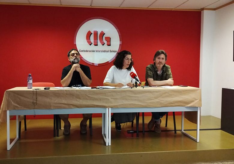 A secretaria nacional da CIG-Autonómica, Zeltia Burgos, o secretario de Organización do sector de Autonómica da CIG, Alexandre Prieto, e Manuel González Fernández de Tejada, delegado de persoal de Servizos Centrais na Xunta de Galiza, compareceron este mércores en rolda de prensa para dar a coñecer o contido e a transcendencia desta sentenza.