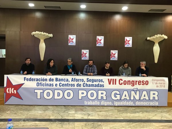 O VII Congreso da federación de Banca, Aforro, Seguros, Oficinas e Centros de Chamadas da CIG abriu co saúdo do secretario comarcal da CIG de Compostela, Pepe Maio e contou ademais coa intervención dos representantes das delegacións convidadas: Joxean Urkiola de LAB; Antoni Alarcón e Josep Clapés Moya, da Intersindical CSC e Joaquim Batalha e Antonio Freitas, da CGTP/SinTAF (Sindicato Nacional de Atividade Financeira).