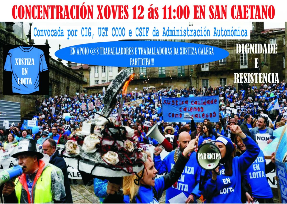 CIG, CCOO, UGT e CSIF da Administración Autonómica teñen convocada unha concentración en solidariedade coas traballadoras e traballadores de Xustiza, en folga desde hai máis de dous meses e que tamén participarán na mesma, para demandar da Xunta que sente a negociar e exixir que se solucione o conflito. A mobilización terá lugar mañá xoves, día 12 de abril, entre as 11:00 e as 11:30 horas na parte superior do edificio administrativo da Xunta de Galiza en San Caetano, pola zona da capela de San Caetano.