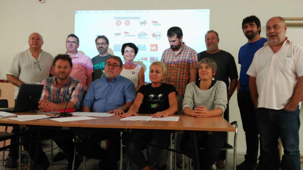 CIG, ELA, LAB, CUT, Intersindical Valenciana, Intersindical Canaria, SAT, Colectivo Unitario de Trabajadores (CUT), ESK, CUT (Galiza), CSI, Confederación Intersindical, COS, STEILAS e STEI participaron este domingo -en Barcelona- nun encontro sindical convocado pola CSC-Intersindical e a IAC no que aprobaron un manifesto no que declaran o seu apoio ao referendo convocado en Catalunya para o vindeiro día 1 de outubro.