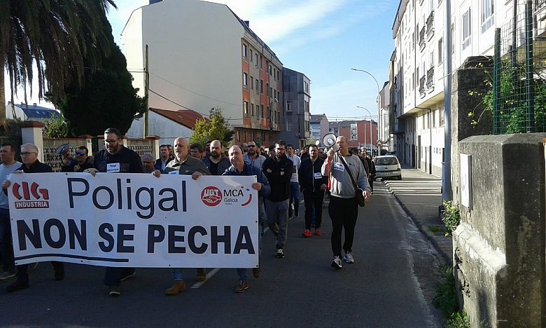 Os traballadores e traballadoras de Poligal saíron en manifestación este luns dende as instalacións da fábrica no Polígono da Gándara até a Casa do Concello de Narón en defensa dos seus empregos e da continuidade da actividade produtiva. Esta protesta enmárcase no calendario de mobilizacións e contactos institucionais que o persoal vai realizar en reposta á solicitude de concurso de acredores presentada pola empresa, a través do que pretende a liquidación da fábrica.