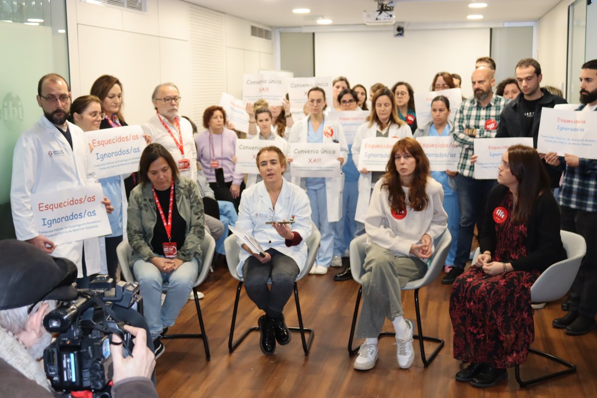 Representantes dos comités das catro fundacións de investigación sanitaria e de medicina xenómica advertiron esta mañá, en rolda de prensa, que valorarán paros parciais ou folga se a consellaría de Sanidade non atende a súa demanda de negociación dun convenio conxunto que dignifique as súas condición laborais e a equiparación ao persoal do SERGAS.