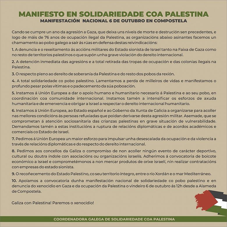 O manifesto concluíu subliñando que “esta mobilización recolle a vaga solidaria do noso pobo desde hai un ano e o posicionamento histórico da Galiza coa Palestina e cos dereitos do seu pobo, mais non representa ningún punto e final. A forza que demostramos hoxe vai ser trasladadas ás institucións galegas para exixir un posicionamento claro, a comezar polos concellos e pola Xunta de Galiza, e continuaremos mobilizándonos e falando da Palestina. Mentres Israel exista, o pobo palestino resistirá. Mentres o pobo palestino resista, nós continuaremos a tender os nosos brazos sobre o mar”.