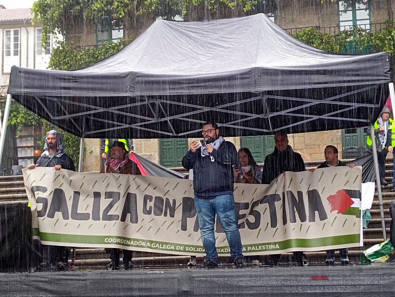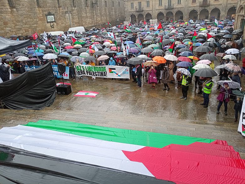 Miles de persoas, chegadas de todos os recunchos de Galiza, desafiaron a intensa chuvia compostelá para berrar contra un ano de masacres e destrución que parece non ter fin; polas máis de 46.000 vítimas mortais ás que lles segaron a voz; contra a impunidade dos crimes de Israel e para dicir aínda “máis alto e máis claro que nós, galegas e galegos, non participaremos en silencio deste xenocidio televisado por moito que si o faga quen nos goberna coas súas declaracións hipócritas e a súa falta de acción”.