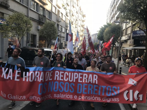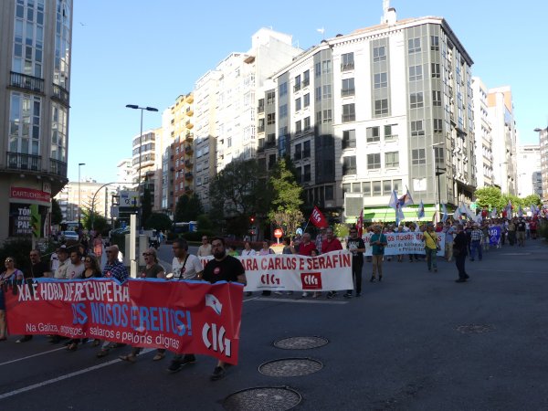 Baixo o lema "Xa é hora de recuperar os nosos dereitos", miles de persoas esixiron nas rúas da Galiza ao novo Goberno do Pedro Sánchez pasos firmes para a derrogación e anulación de todas as reformas antiobreiras e antisociais impostas so pretexto da crise. "Xa non valen os xestos, non valen as escusas da falta de respaldo parlamentar para non derrogar a reforma laboral. De igual maneira que se chegou a un acordo para poñer fin ao Goberno do PP, teñen que conseguir a correlación de forzas necesarias para o cambio de políticas, porque senón estaremos ante un grande engano e unha fraude".