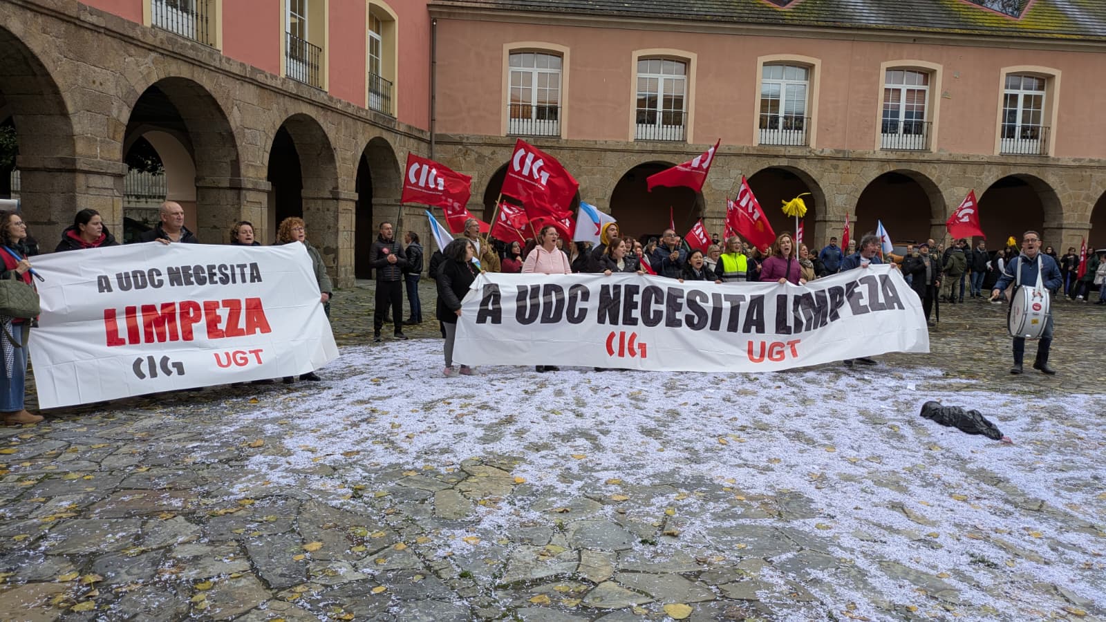 Persoal da limpeza da Universidade da Coruña iniciou este xoves mobilizacións para reclamar condicións de traballo dignas cun paro de dúas horas no campus coruñés e un paro dunha hora no campus de Ferrol. Ademais desenvolveron unha concentración diante do Reitorado para reclamar que se cumpran os compromisos adquiridos pola institución no ano 2023, cando o persoal deste servizo foi internalizado a través da FUAC.
