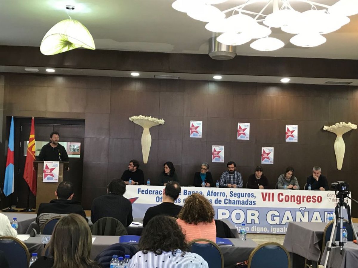 O secretario xeral da CIG, Paulo Carril, que foi o encargado de clausurar o VII Congreso da federación Banca, Aforro, Seguros, Oficinas e Centros de Chamadas, denunciou o avance da precariedade e da represión no Estado español e emprazou a abrir un debate para a convocatoria dunha folga xeral coa que exixir a recuperación dos dereitos laborais e sociais arrebatados á clase traballadora so pretexto da crise.