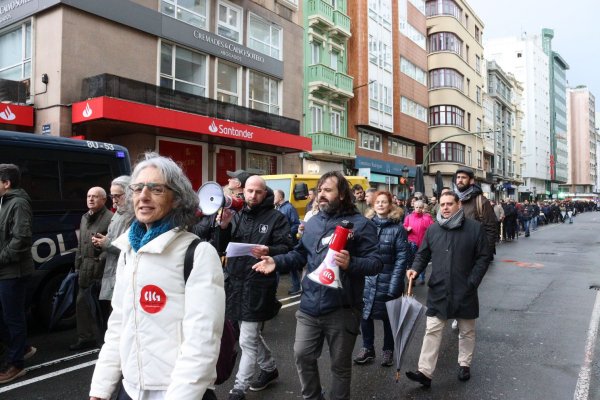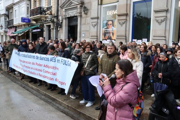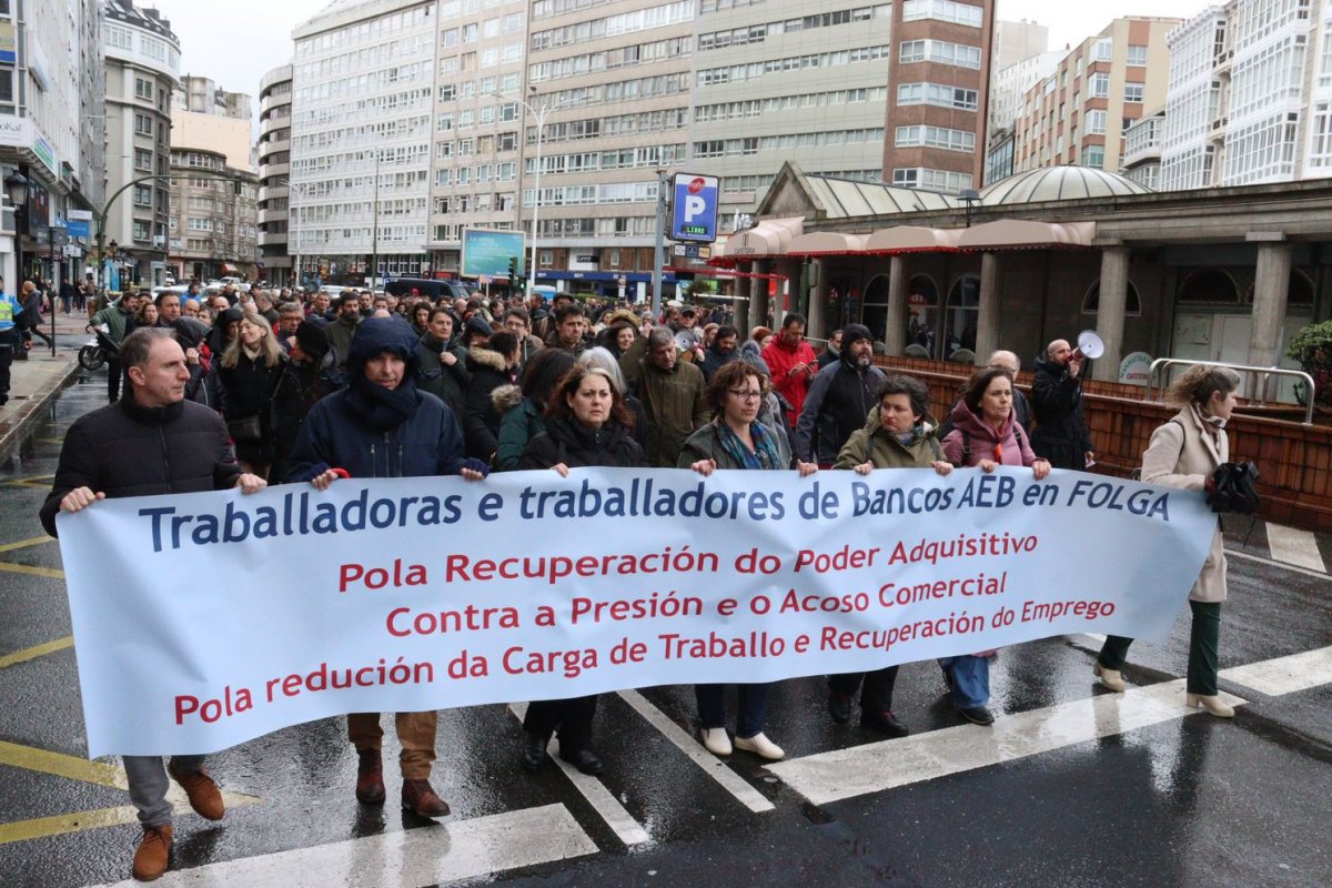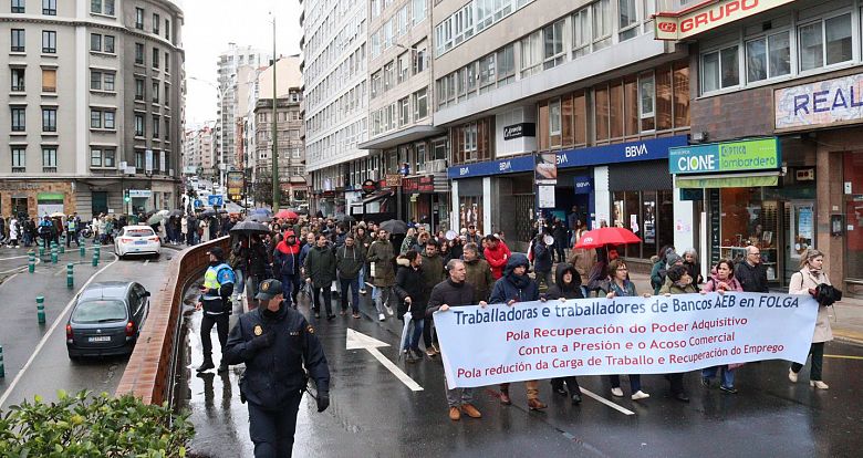 Miles de traballadoras e traballadores dos bancos AEB (Santander, BBVA, Sabadell, Bankinter, Deutsche Bank, etc.) manifestáronse este xoves na Coruña para reclamar a recuperación do poder adquisitivo, a redución da carga de traballo e a recuperación do emprego, e contra a presión e o acoso comercial brutal que padecen. A mobilización desenvolveuse coincidindo coa xuntanza da mesa de negociación do convenio colectivo e no marco da xornada de folga convocada pola CIG, ELA, Intersindical–CSC e SEC–BBVA en Galiza, Euskadi e Catalunya.