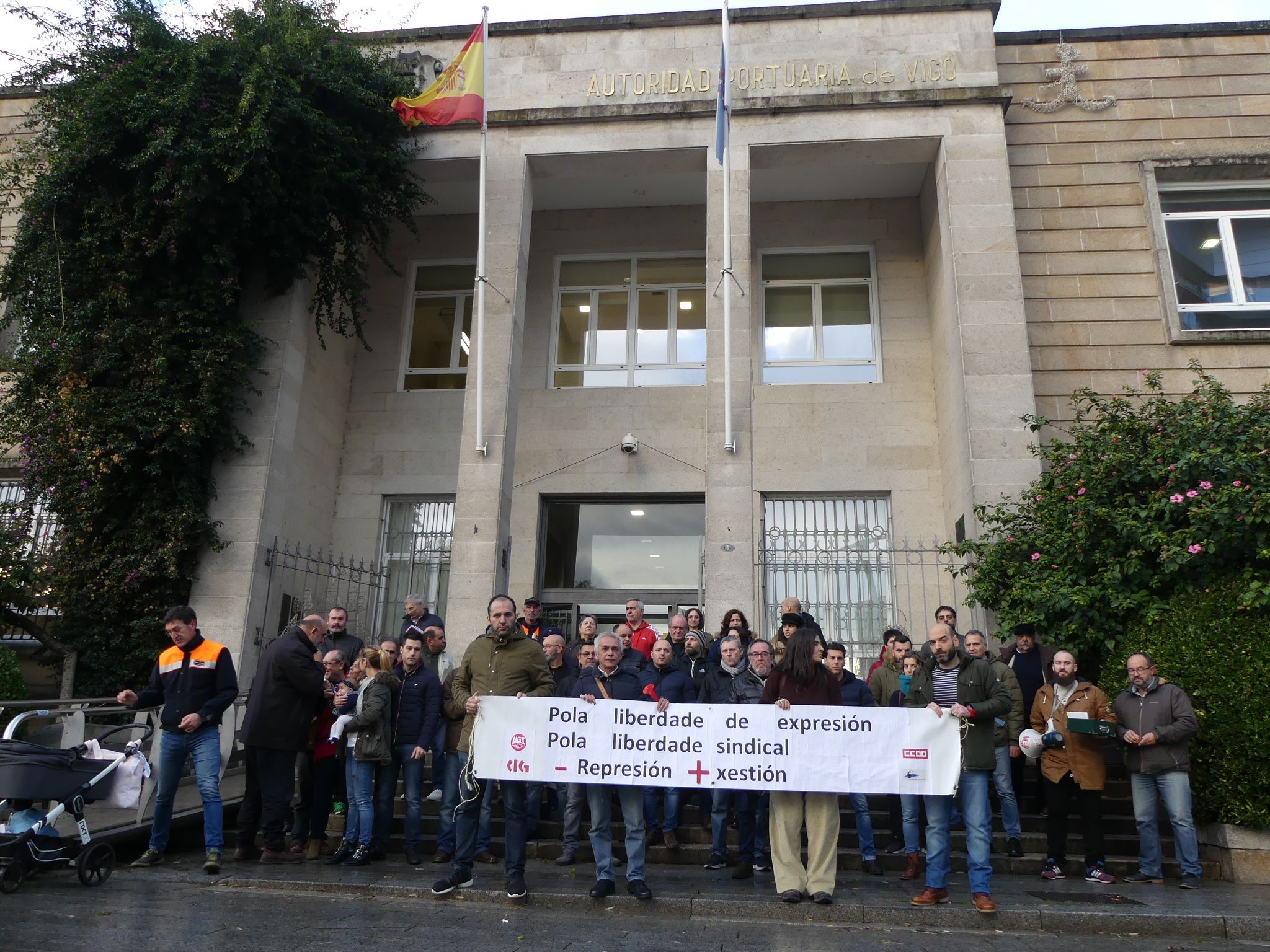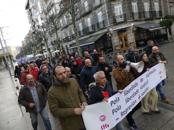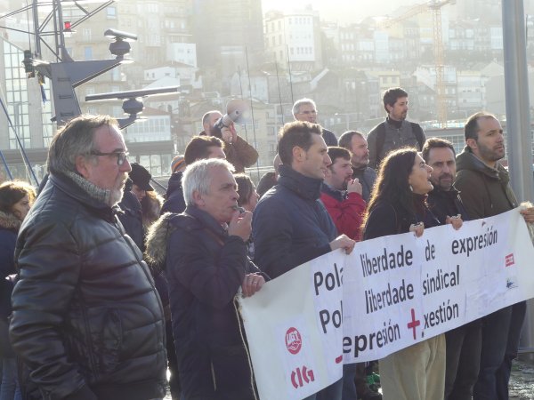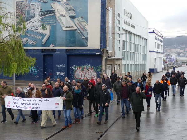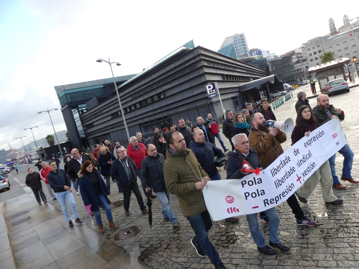 Máis de medio cento de persoas participaron hoxe na manifestación convocada polo comité de empresa da Autoridade Portuaria de Vigo (APV) en solidariedade cos catro compañeiros aos que presidente lles reclama 25.000 euros por supostas inxurias e calumnias nun comunicado interno. Dende a representación dos traballadores/as instan a Enrique López Veiga, que foi apupado ao remate do consello de administración do ente público, a presentar unha denuncia contra o comité no seu conxunto xa que as críticas á súa xestión foron expresadas por este órgano colexiado.