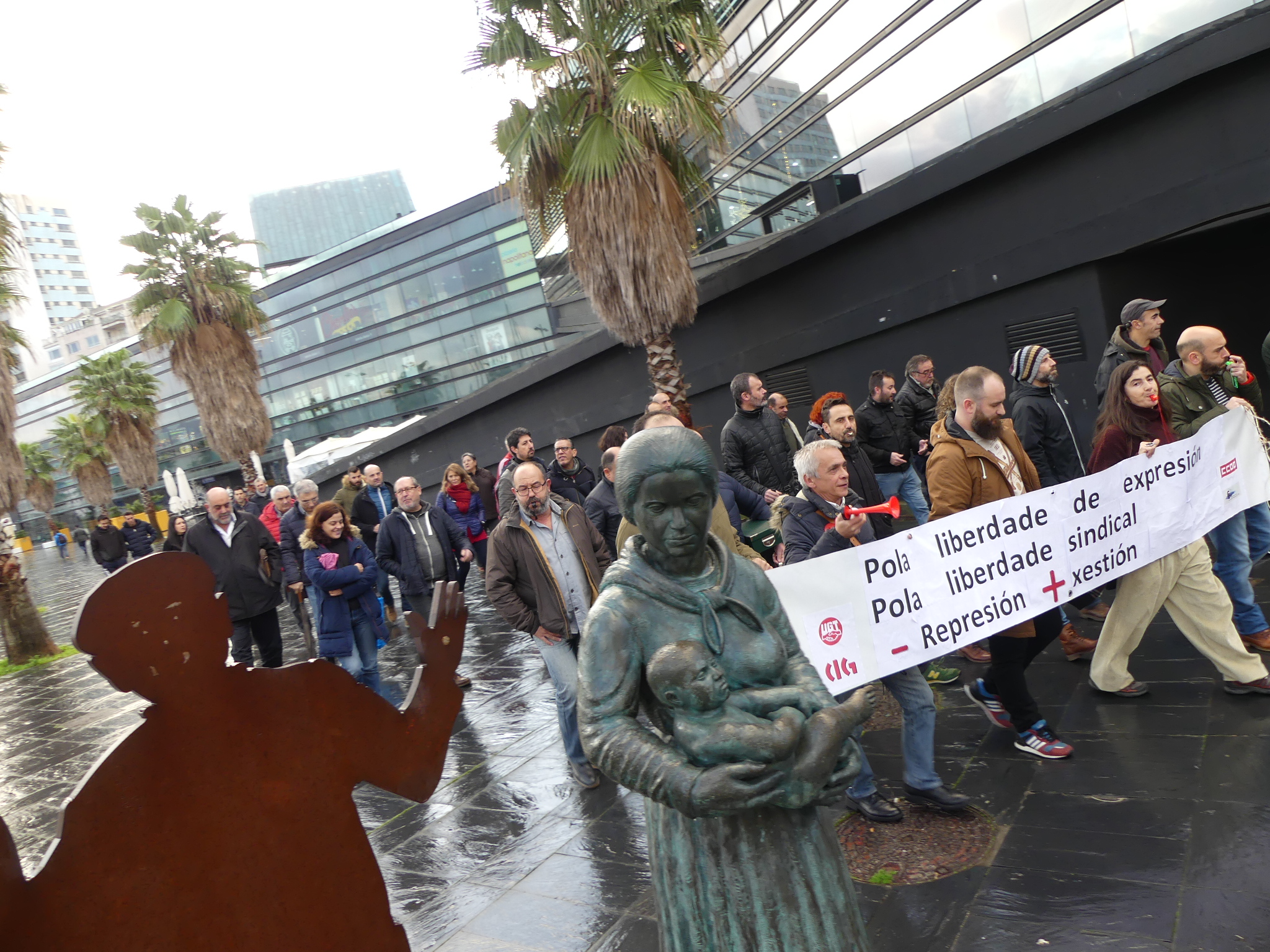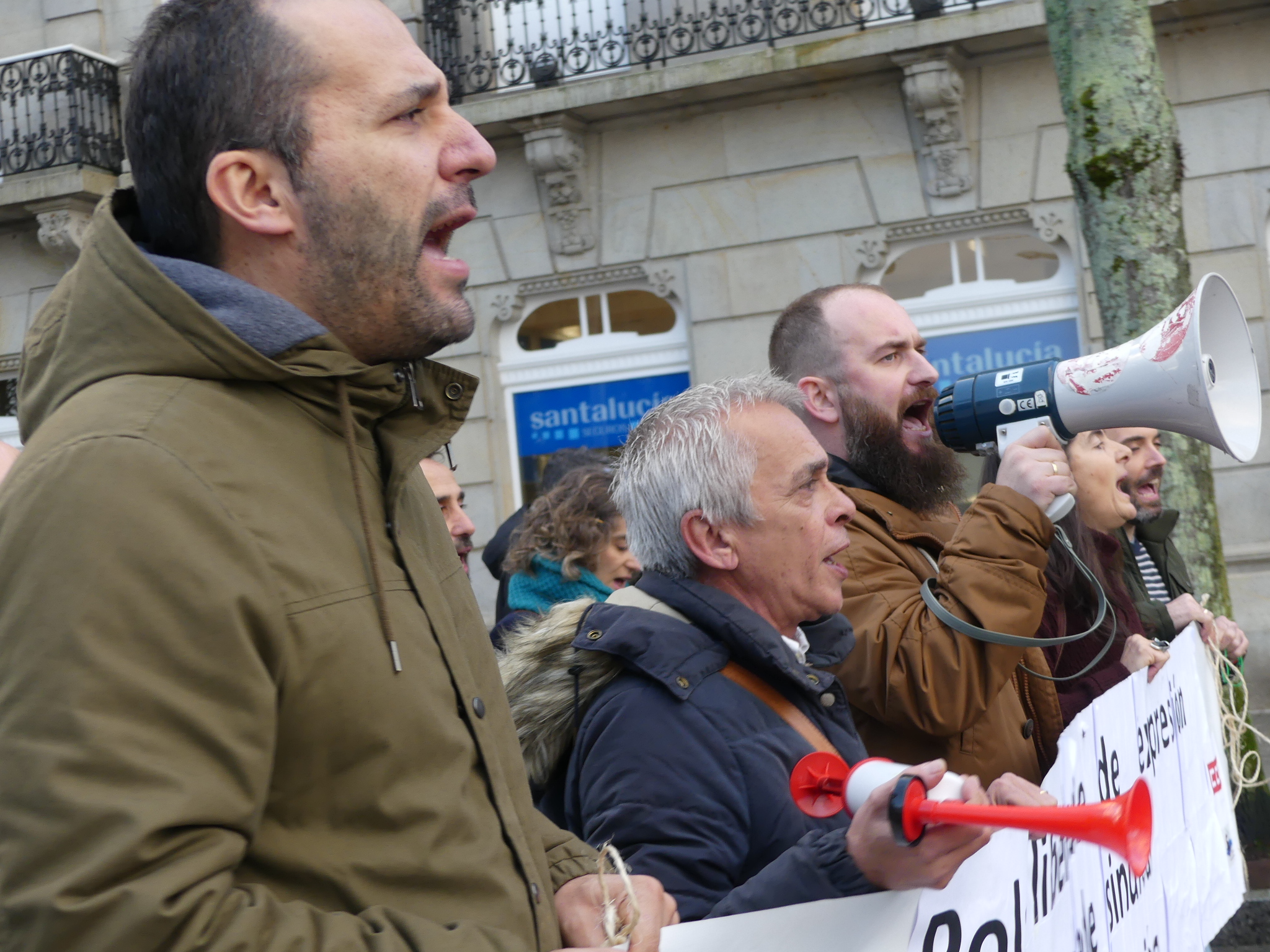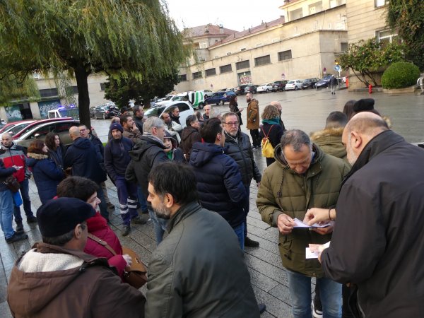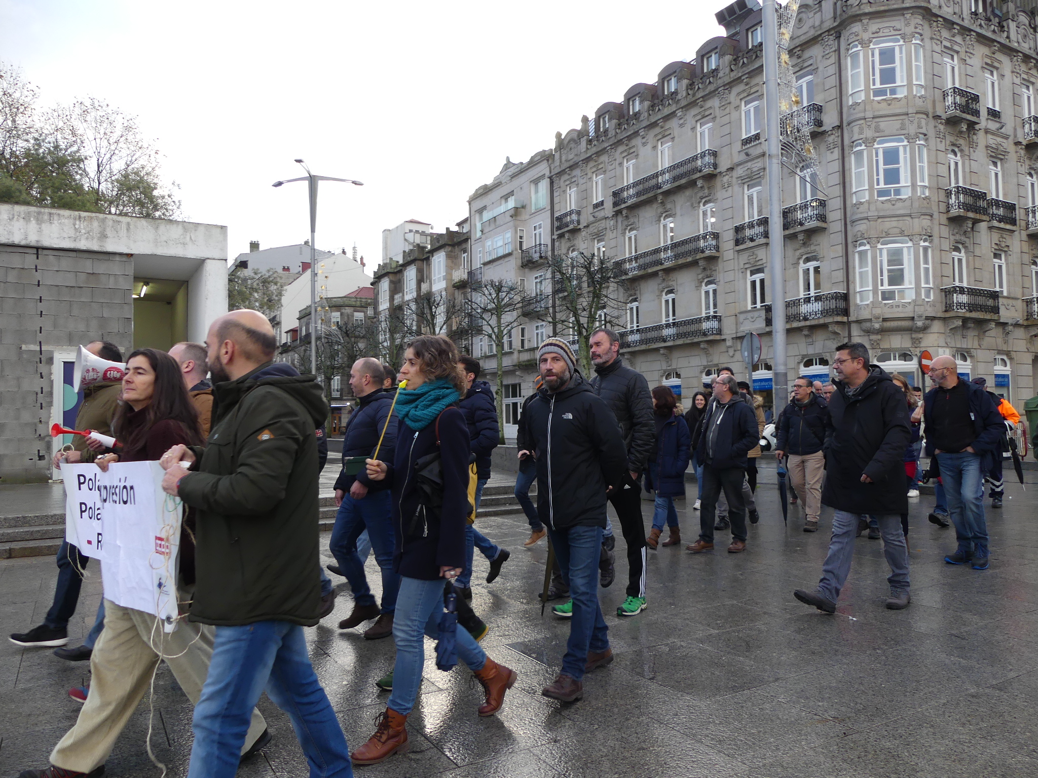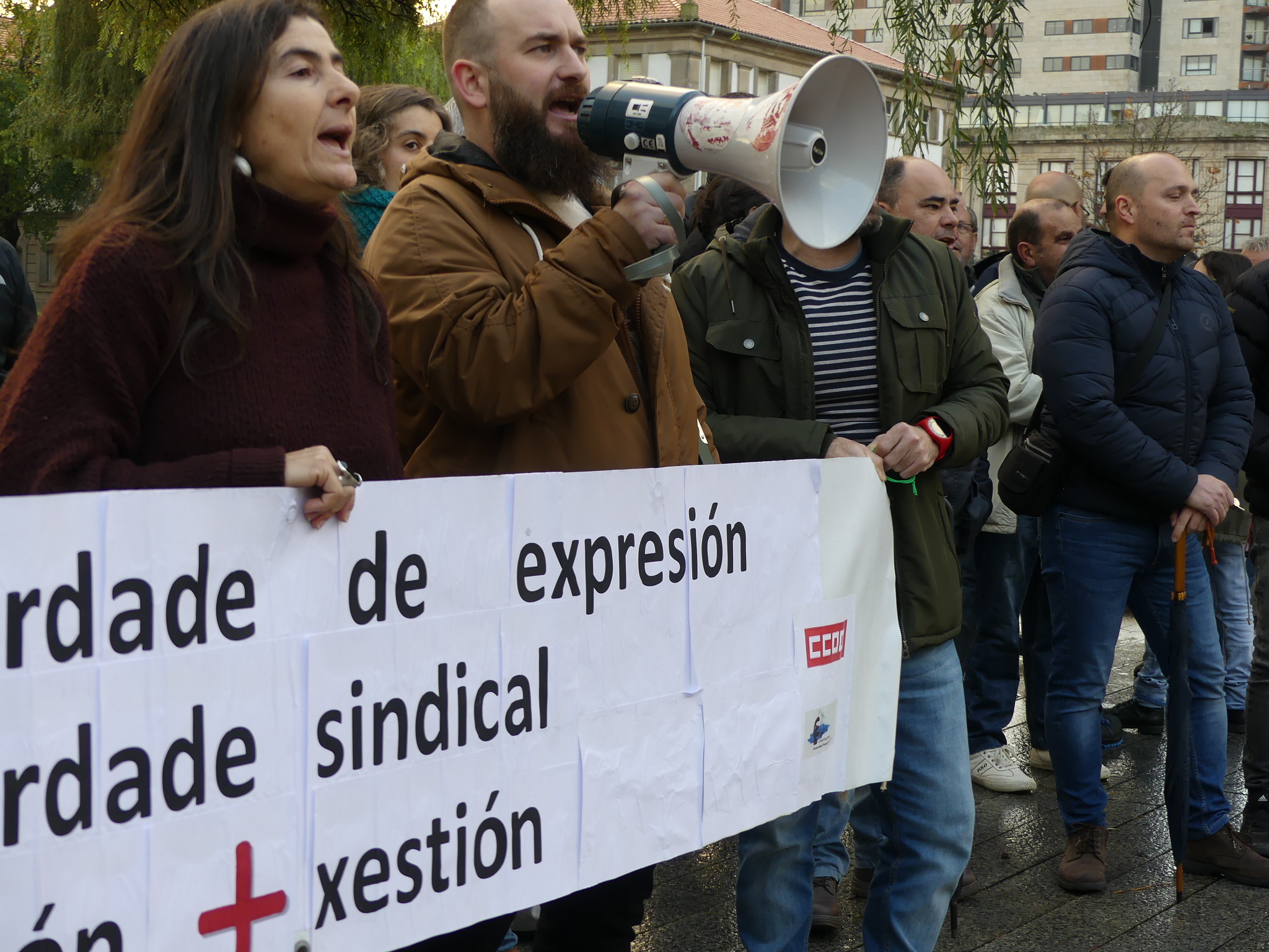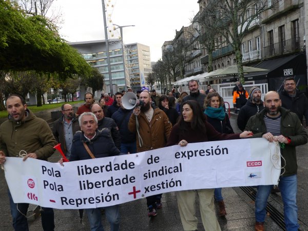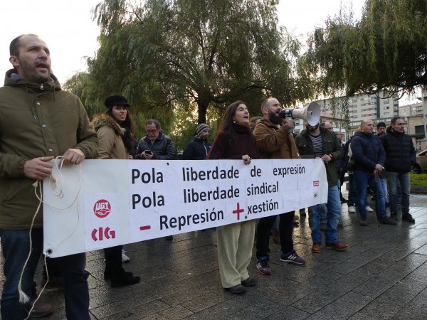 Durante o traxecto berráronse consignas como “Máis xestión e menos represión”, “De mal presidente é atacar a súa xente”, “Aquí están os demandados”, “Feijóo, atende, cesa o presidente”, “Se queres cartos vai traballar” ou “O inmoral é denunciar o persoal” e recolléronse achegas económicas para sufragar a defensa dos traballadores denunciados.