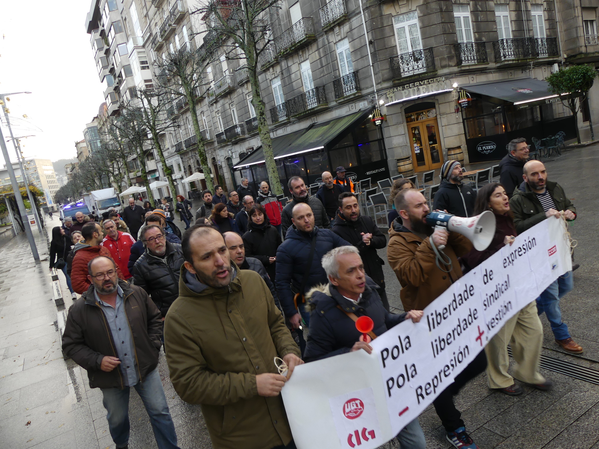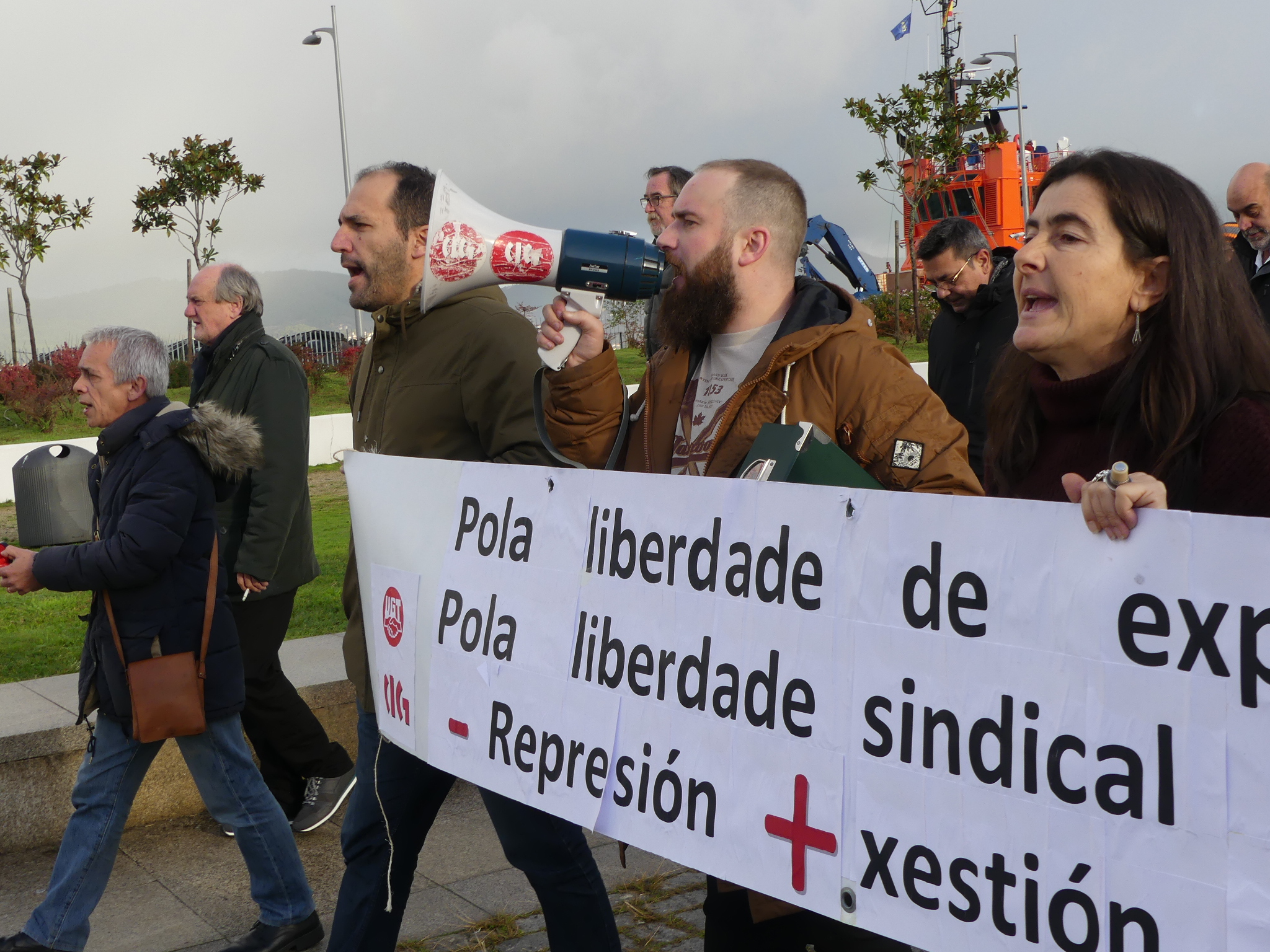 A marcha en apoio dos catro delegados do comité afectados (dous da CIG e dous da UGT) arrincou da sede da APV, na praza da Estrela, pasadas as 9:00 horas, unha vez que López Veiga abandonou as instalacións para dirixirse ao edificio de sesións onde ía ter lugar o consello de administración, situado no peirao de transatlánticos.