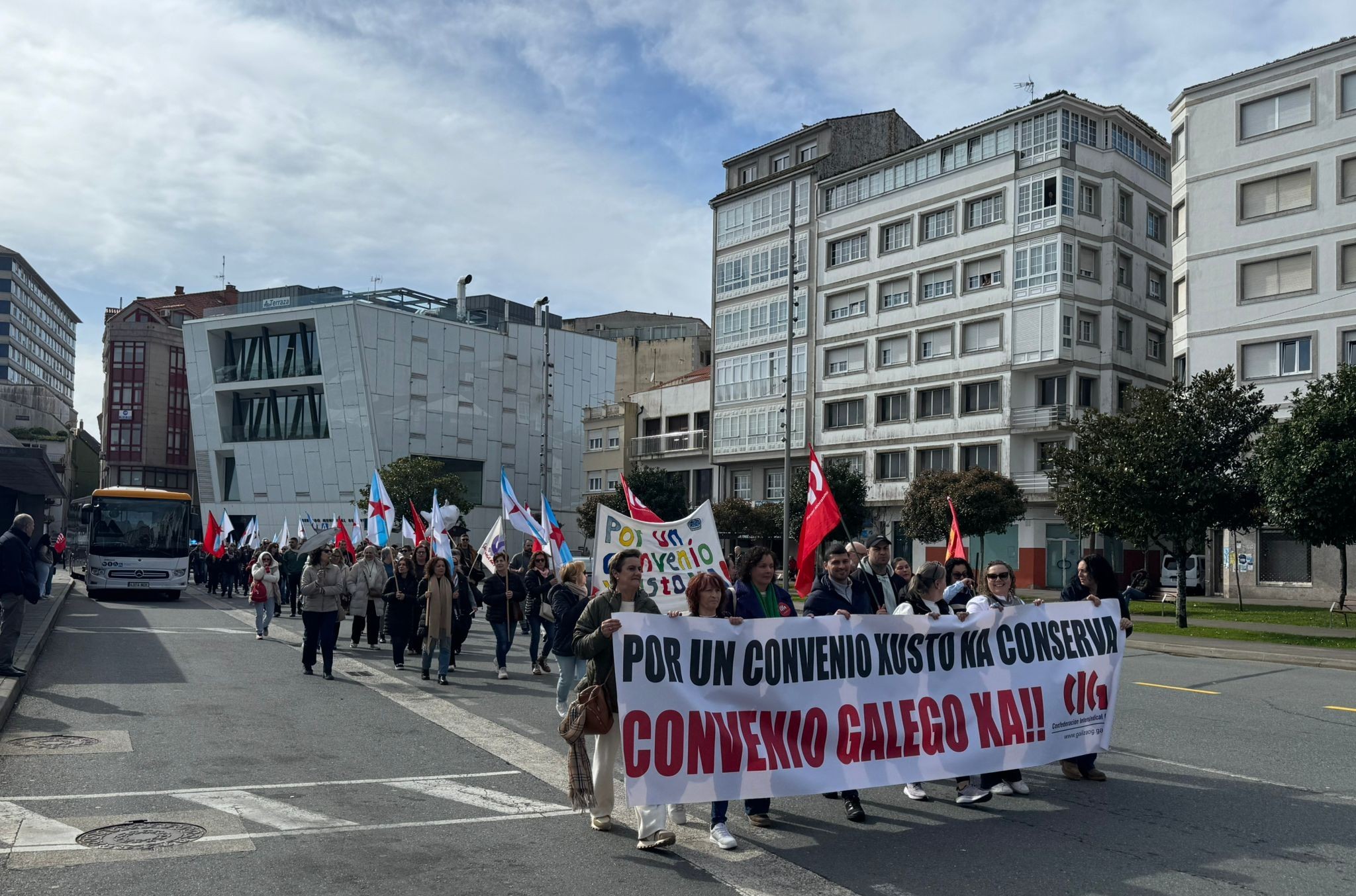 Persoal do sector conserveiro galego volveu mobilizarse hoxe para rexeitar o acordo de convenio colectivo regresivo asinado en Madrid por UGT e CCOO. Varios centos de persoas traballadoras percorreron as rúas da localidade barbancesa de Ribeira para reclamar unha suba salarial real e unha redución da xornada laboral.