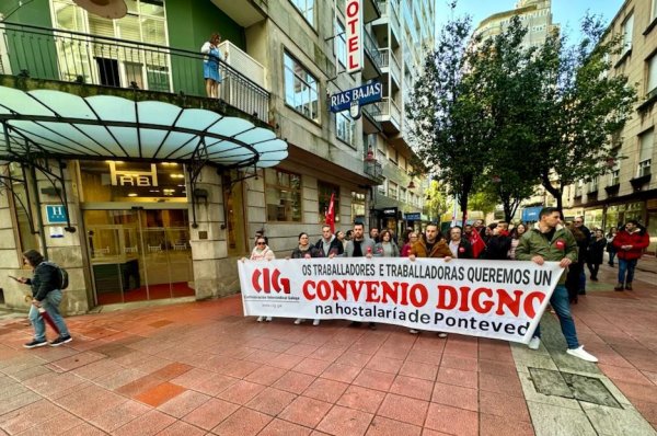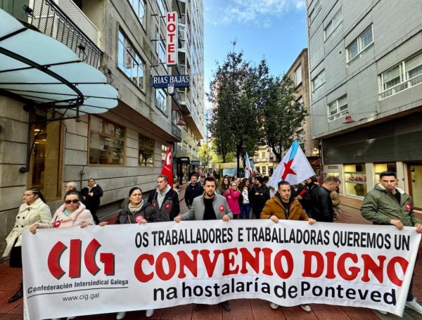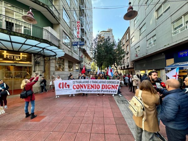 Un grupo de traballadores/as da hostalaría pontevedresa desenvolveron hoxe unha mobilización diante do Hotel Rías Bajas de Pontevedra convocados/as pola CIG-Servizos para reclamar un convenio colectivo provincial que free a crecente precariedade no sector e denunciar o bloqueo das negociacións.