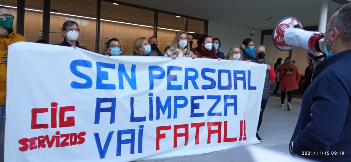 Traballadoras e traballadores do servizo de limpeza dos centros de saúde, PAC e consultorios da área sanitaria da Ferrol concentráronse este luns diante do centro de saúde de Narón para protestar pola insostíbel situación laboral que padecen, debido a que as horas requiridas pola Xerencia resultan insuficientes para poder realizar o traballo en condicións dignas.