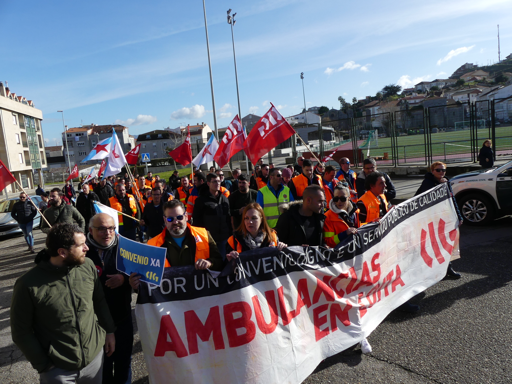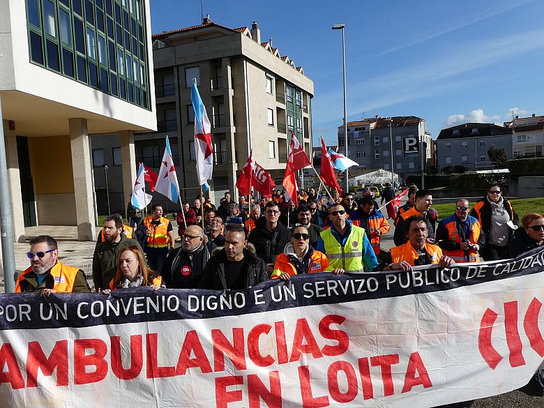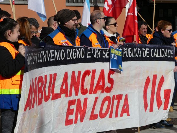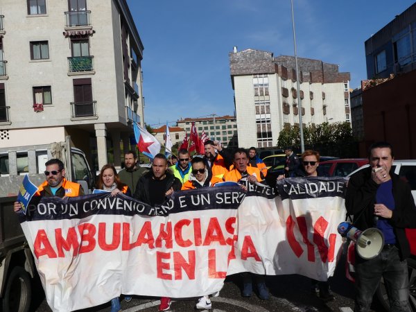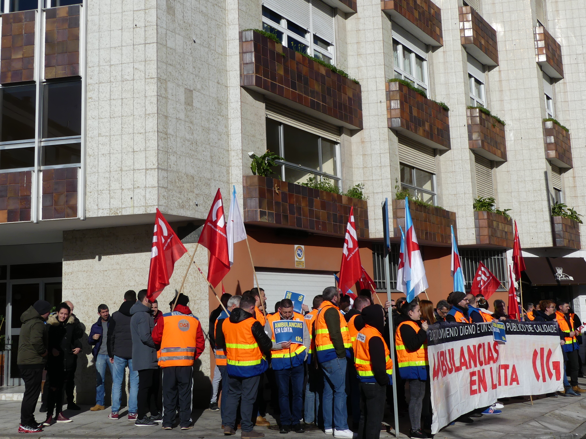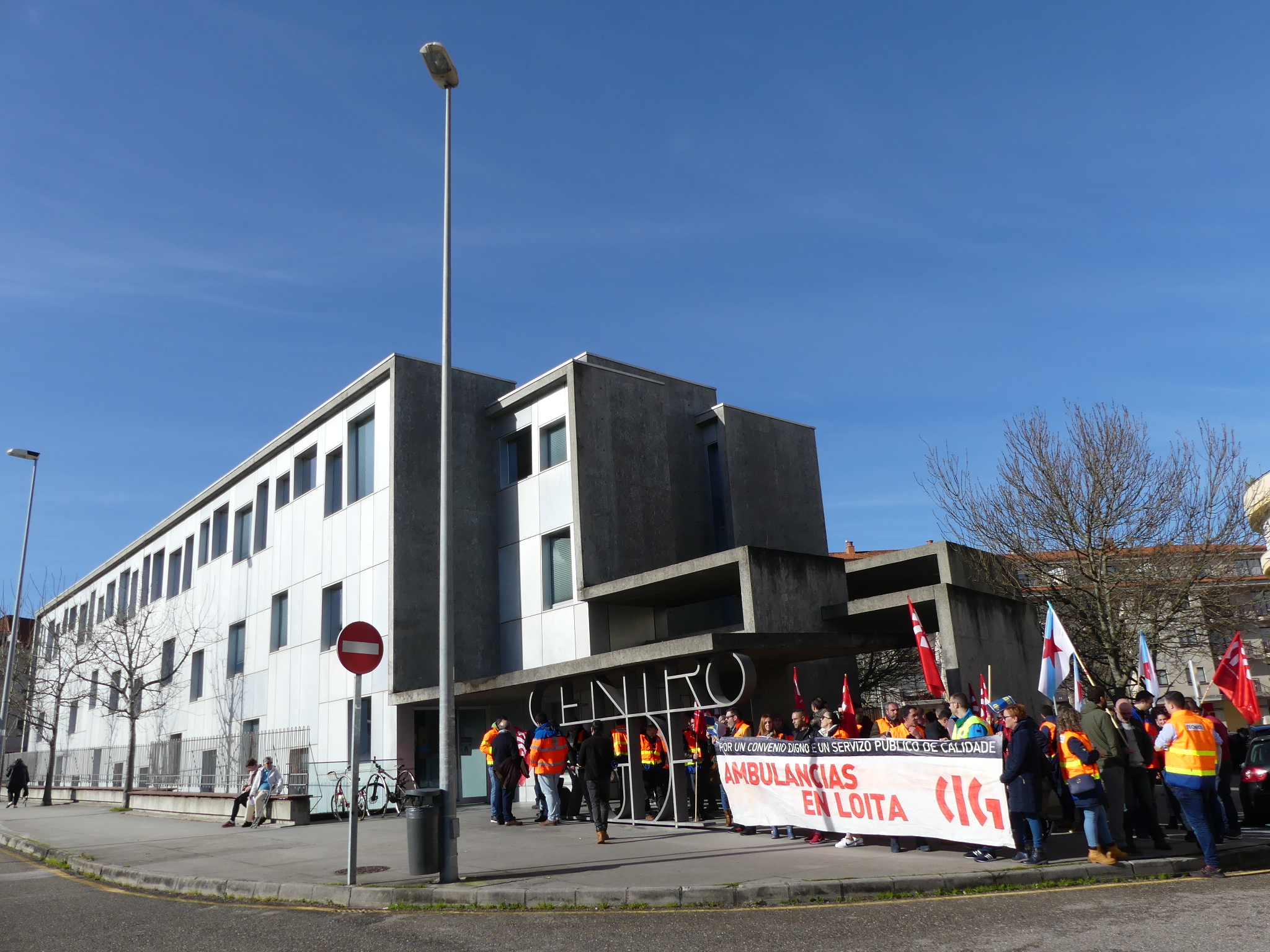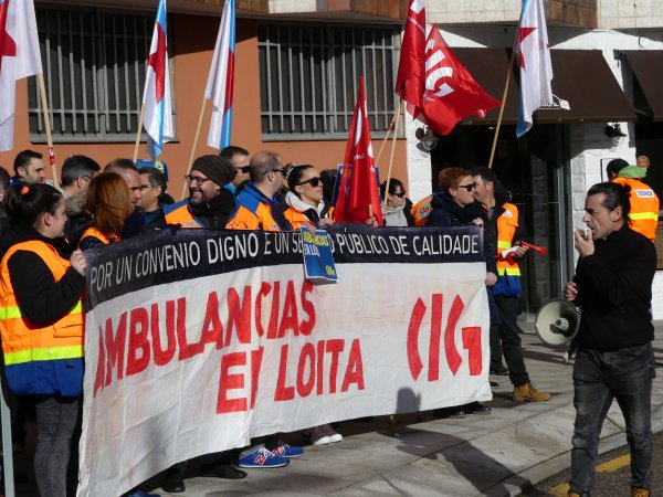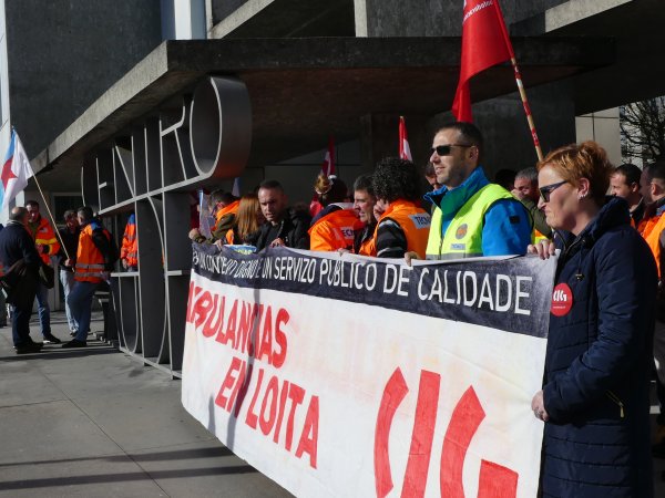 Máis de medio cento de empregados/as e representantes sindicais do sector do transporte sanitario chegados/as de distintas localidades do país participaron esta mañá na concentración convocada pola CIG ás portas do edificio onde reside o máximo responsábel da sanidade galega para sinalar a responsabilidade da Xunta na situación na que se atopa o persoal das ambulancias: tres anos sen convenio colectivo e con condicións laborais de absoluta precariedade (horas extras sen cobrar ou mal pagadas, sen os descansos nin as vacacións regulamentarias, con material e uniformes deficientes e con sobrecarga de traballo por falta de persoal).