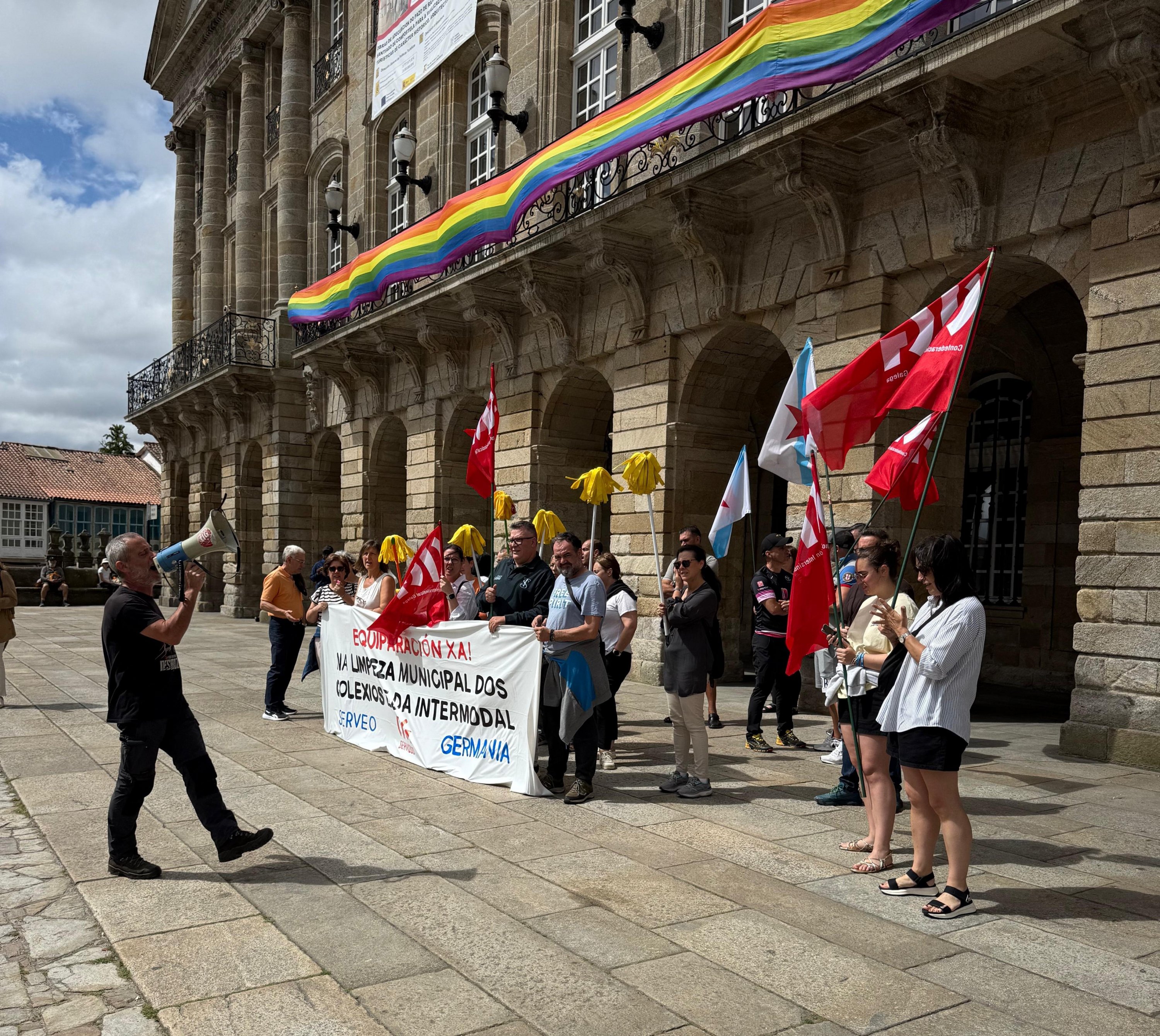 Traballadoras e traballadores de Serveo (encargada da conserxería e a limpeza dos colexios públicos de Compostela) e Limpiezas Germania (que presta servizos na estación intermodal a través da empresa municipal Tussa) concentráronse este mércores na Praza do Obradoiro para reclamar melloras salariais e laborais e rematar coa discriminación retributiva que sofren.