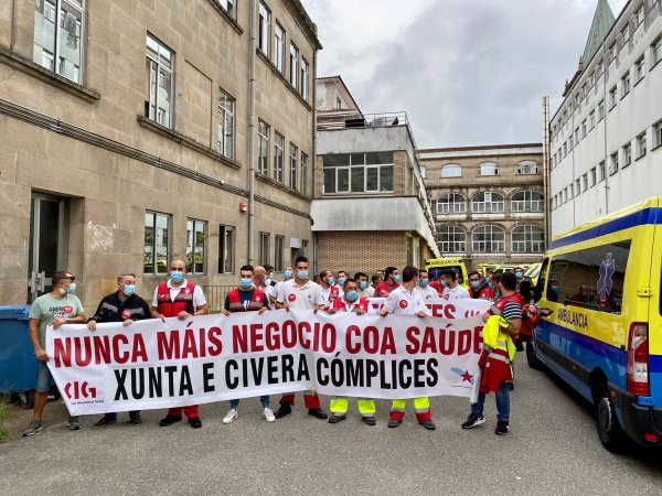 Traballadores e traballadoras de Ambulancias Civera concentráronse esta mañá na porta de acceso a Consultas do Hospital Provincial de Pontevedra para denunciar o deterioro das condicións laborais que sofren desde que hai 17 meses a Xerencia da Área Sanitaria sacou un concurso público deficitario contratando a esta empresa dirixida desde Valencia.
