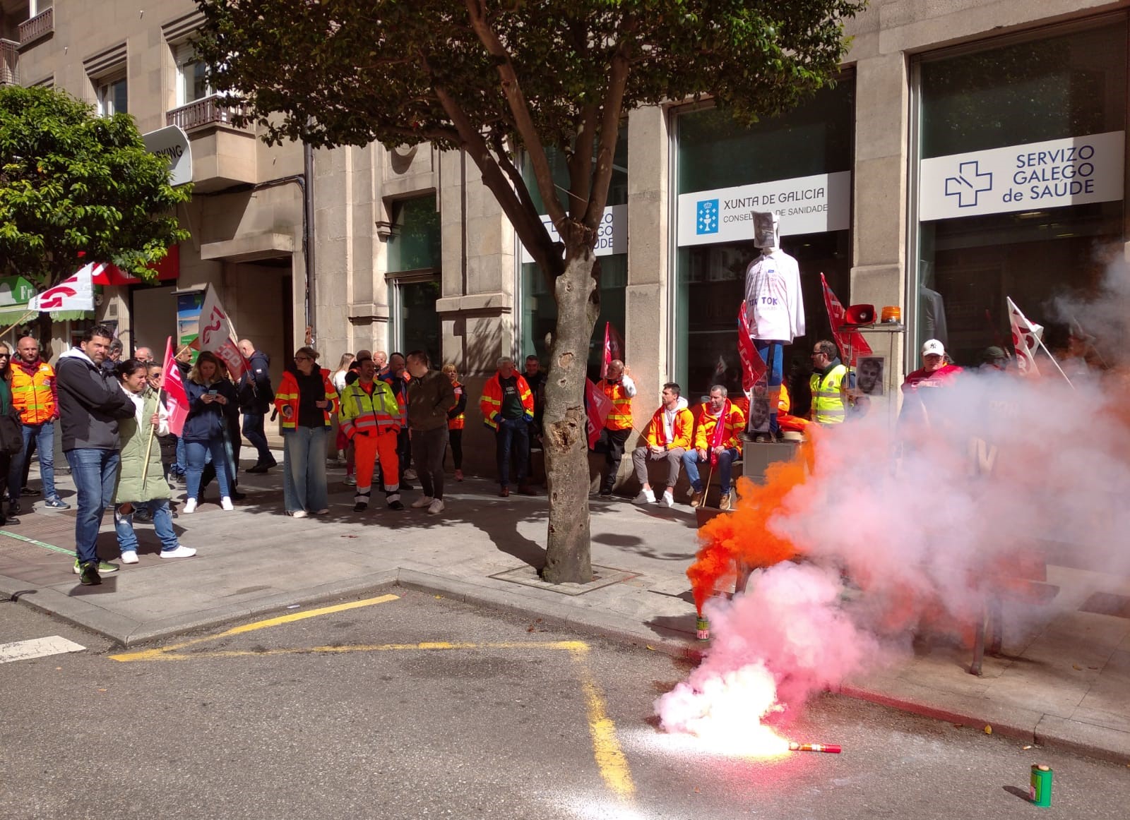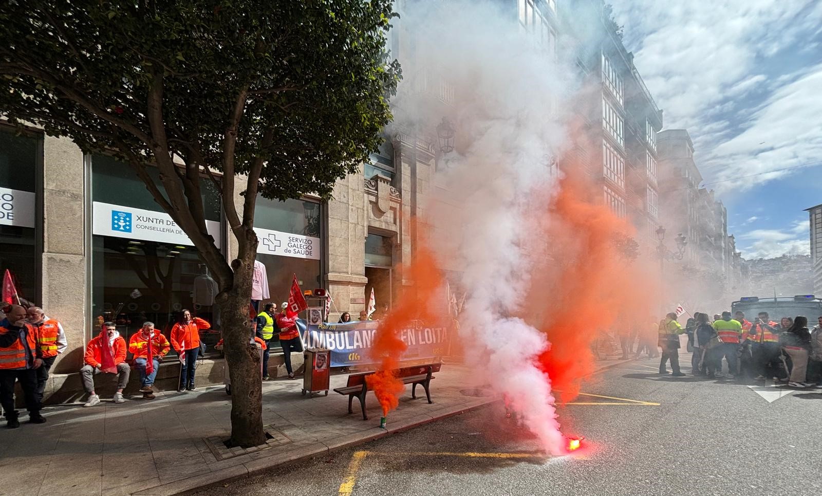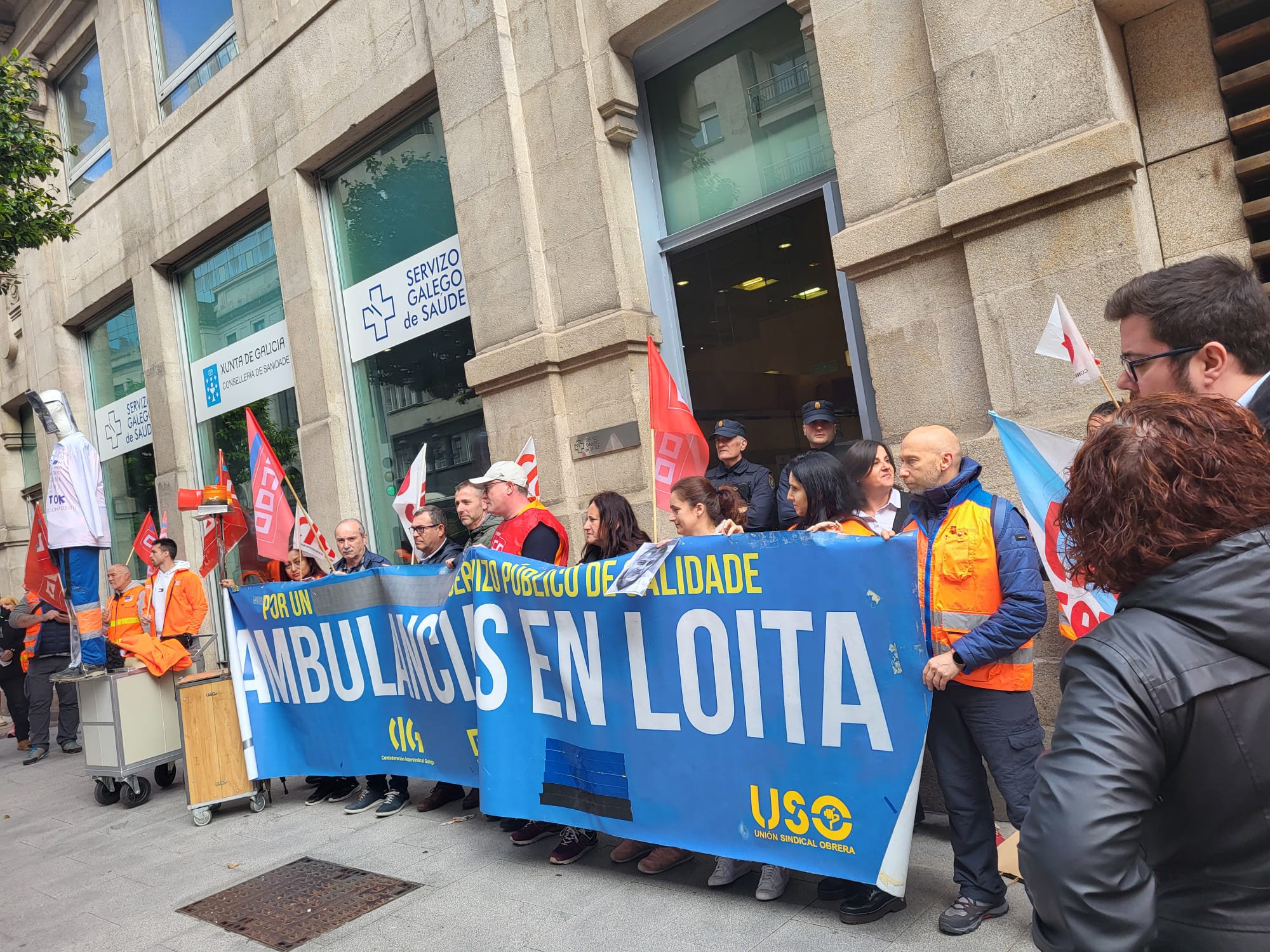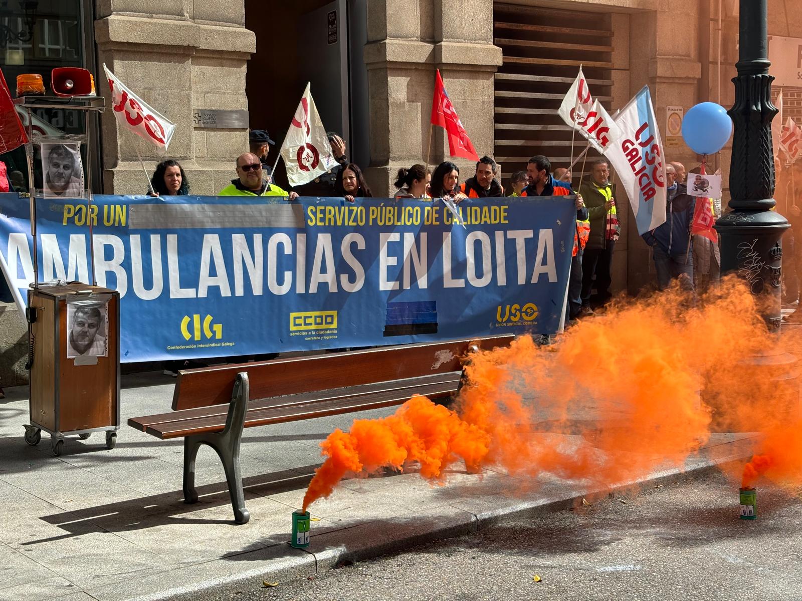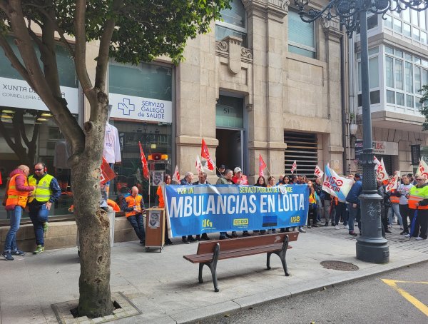 Persoal de Ambulancias do Atlántico e delegados/as sindicais do sector de ambulancias mobilizáronse este mediodía diante da delegación do Sergas en Vigo para reclamarlle á Xunta que inicie o proceso e dispoña os fondos necesarios para que unha nova empresa asuma o contrato de emerxencia e o servizo de transporte urxente de Vigo, Cangas e Moaña e o non urxente de toda a área sanitaria tras a renuncia da actual concesionaria.