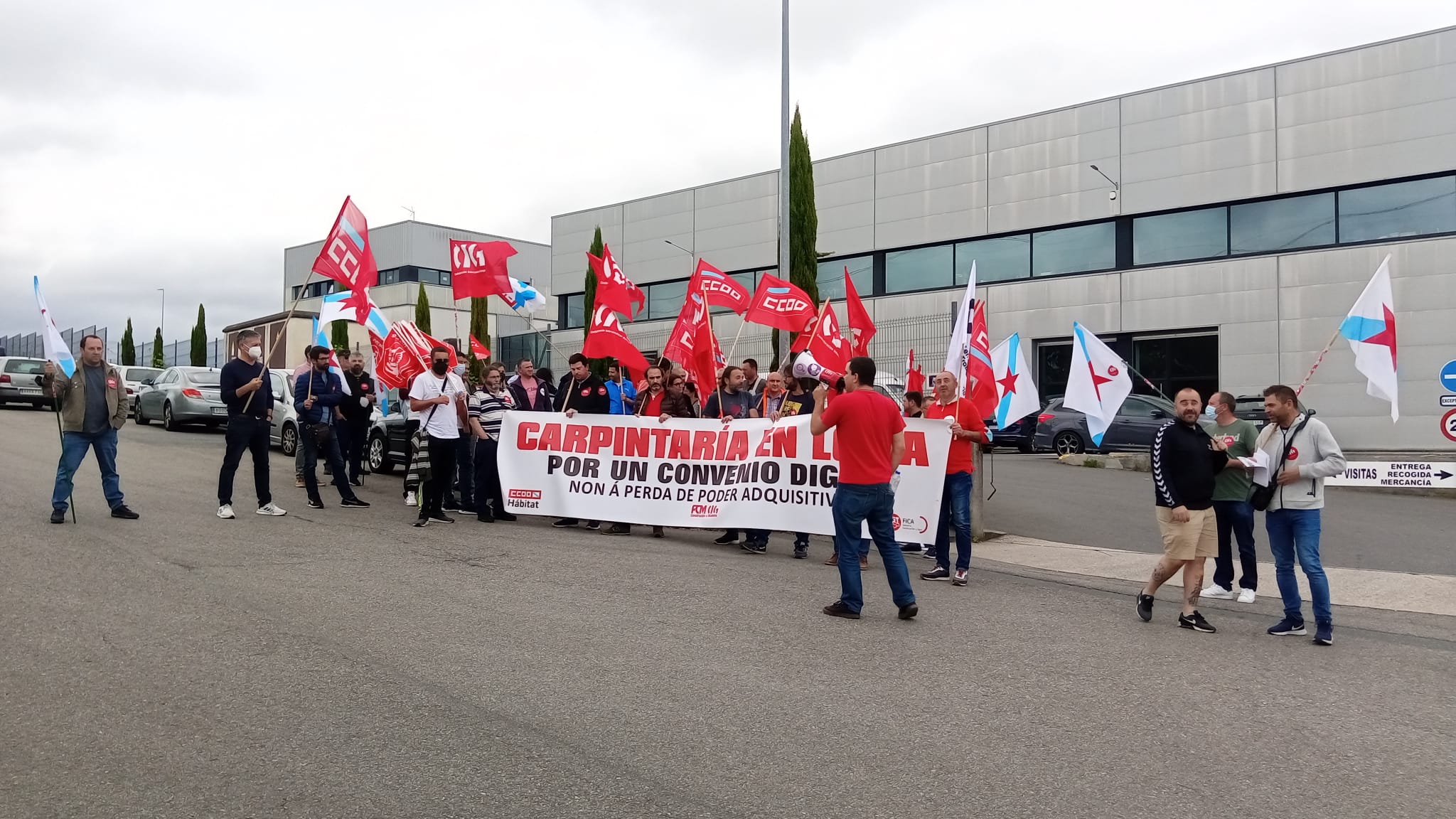Traballadores e traballadoras do sector de Carpintería e Ebanistería da provincia da Coruña concentráronse este mércores diante das instalacións que o Grupo Malasa ten en Cerceda, para reclamar o desbloqueo das negociacións do convenio colectivo e incrementos salariais con cláusulas de revisión sen topes, que garantan o mantemento do poder adquisitivo ante o incremento imparábel da carestía da vida.