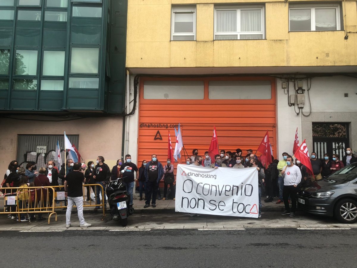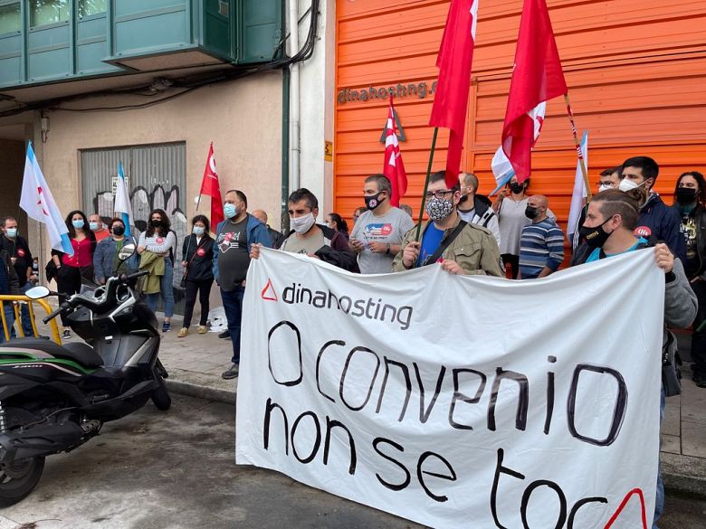 Con consignas como "Dinahosting precariza!" ou "O convenio non se toca!", decenas de traballadores e traballadoras da empresa santiaguesa Dinahosting concentráronse, este martes, diante do centro de traballo de Salvadas para rexeitar a caída unilateral por parte da empresa do convenio colectivo, que estaba a ser negociado polo comité de empresa coa dirección.