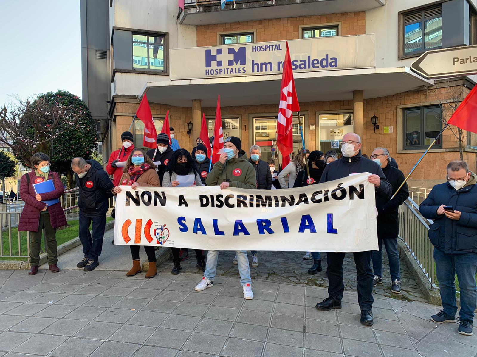 A CIG realizou unha nova concentración este martes diante do hospital HM Rosaleda de Santiago para esixir o remate das discriminacións salariais, un reforzo dos cadros de persoal e unhas condicións retributivas e de traballo dignas na sanidade privada.