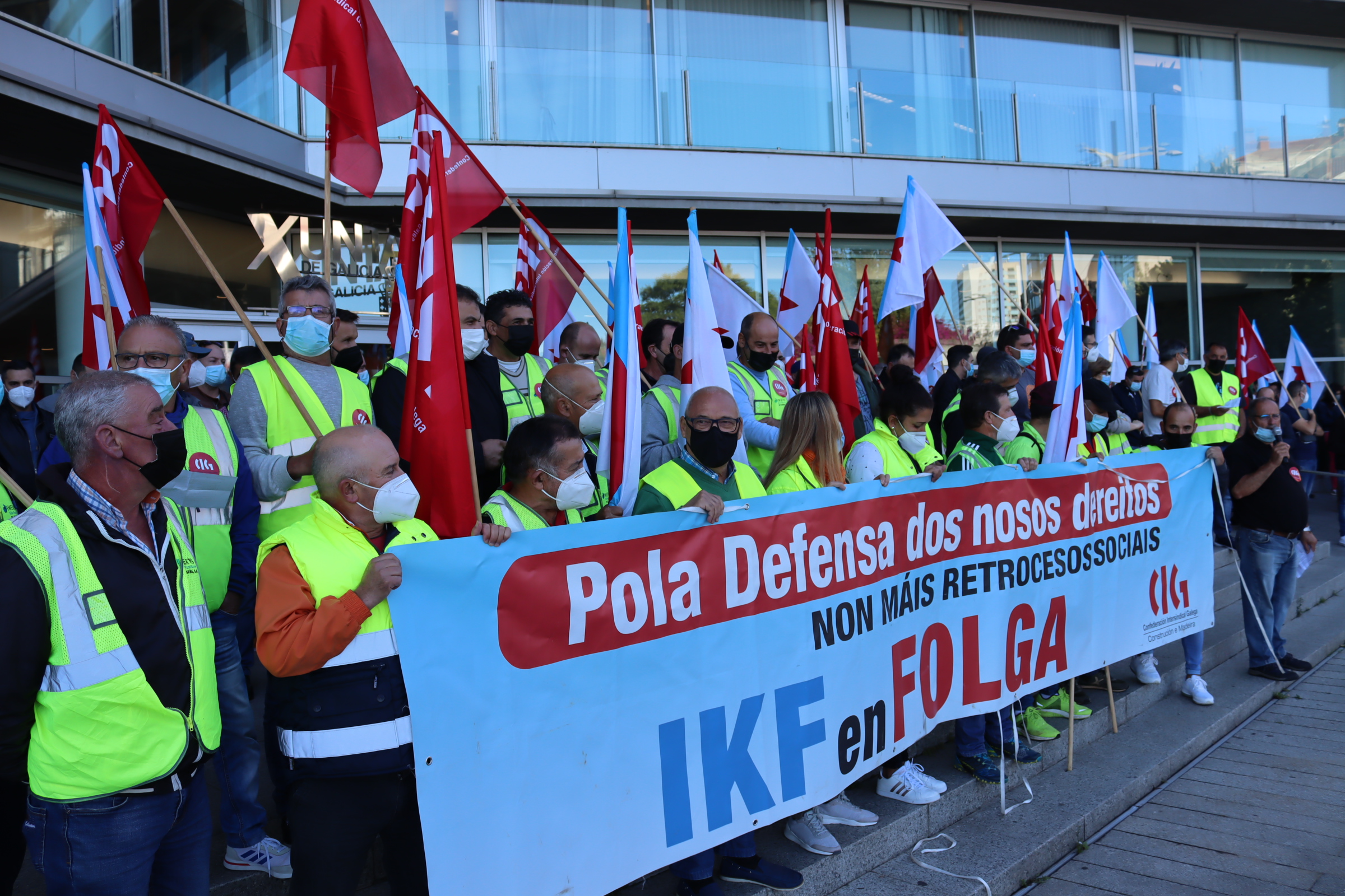 A concentración ás portas da delegación do Goberno autonómico na cidade desenvolveuse entre as 11:00 e as 13:00 horas, tempo no que os afectados/as despregaron unha faixa na que se podía ler “Pola defensa dos nosos dereitos. Non máis retrocesos sociais. IKF en folga” e berraron consignas como “A igual traballo igual salario”, “IKF escoita estamos en loita” ou “Non somos escravos somos traballadores”.
