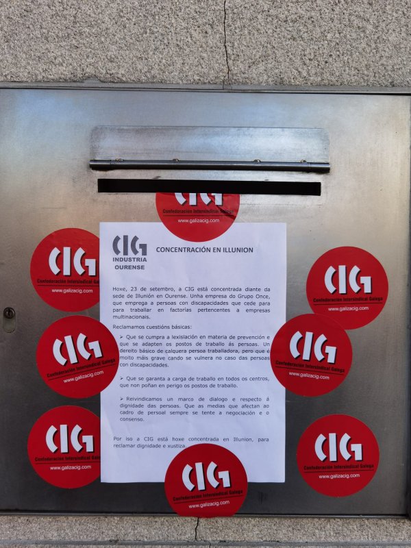 Persoal de Ilunion, centro especial de emprego do grupo ONCE, mobilizouse hoxe en Ourense xunto a delegados/as da CIG-Industria para rexeitar os abusos laborais por parte da empresa, despois de que tivesen que acudir ao xulgado para que a dirección dese marcha atrás na súa intención de recortar os pluses e os complementos “sen negociar nin dar sequera explicacións”.